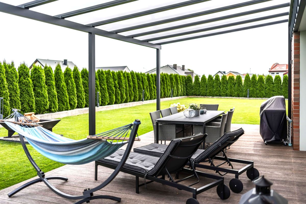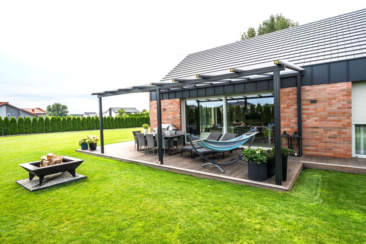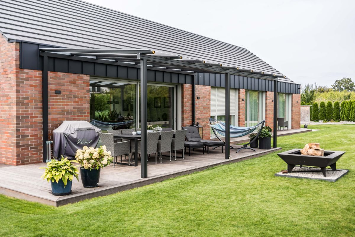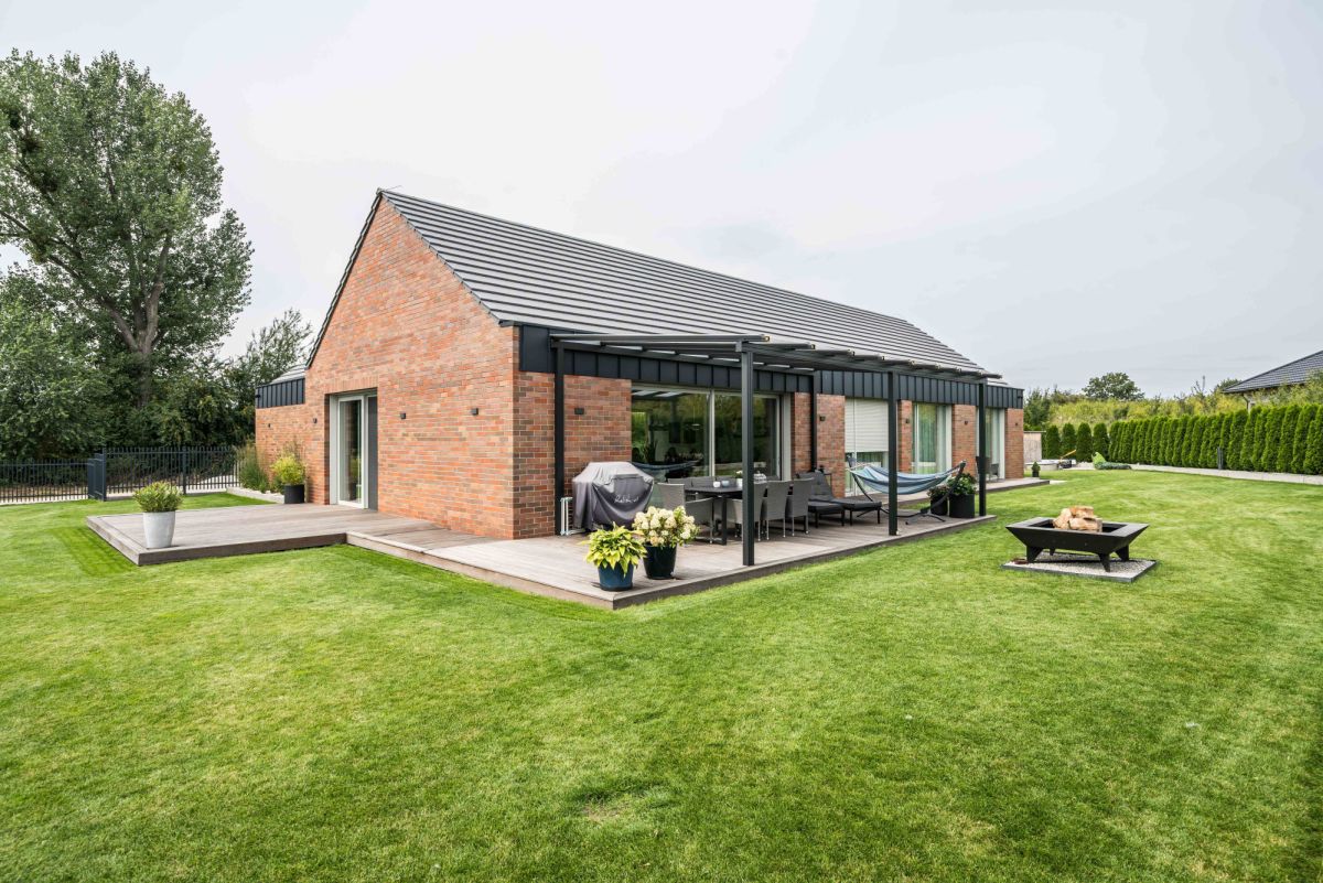 Centralnym miejscem pozostaje taras — naturalne przedłużenie domu i główna przestrzeń wypoczynkowa.