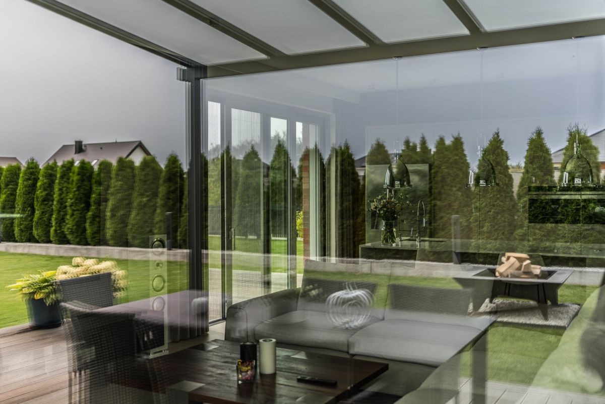 Salon z wygodną strefą wypoczynkową doświetlony jest panoramicznymi przeszkleniami HS o wysokości 254 cm. Duże przesuwne okna prowadzą bezpośrednio na taras — zadaszony lekką konstrukcją, wykończony impregnowanym drewnem i zaprojektowany jako naturalne przedłużenie przestrzeni dziennej, z miejscem do wypoczynku i spotkań przy ogniu.