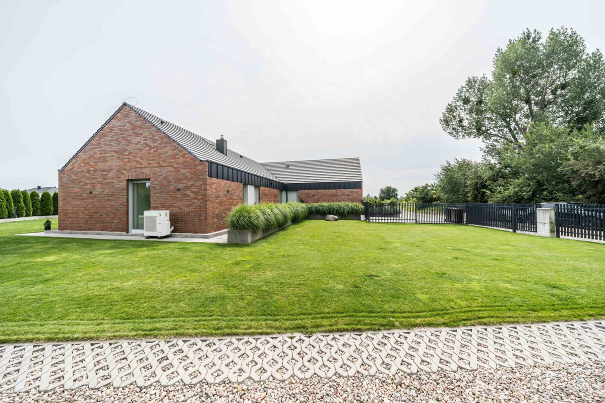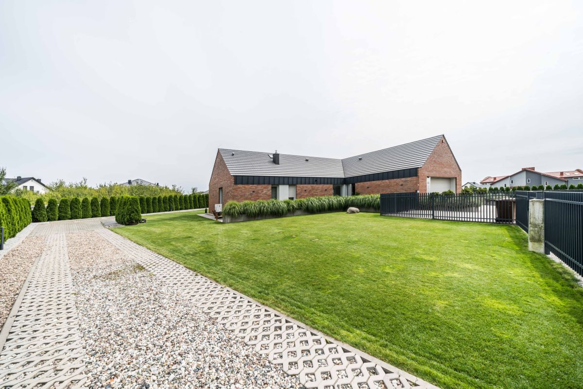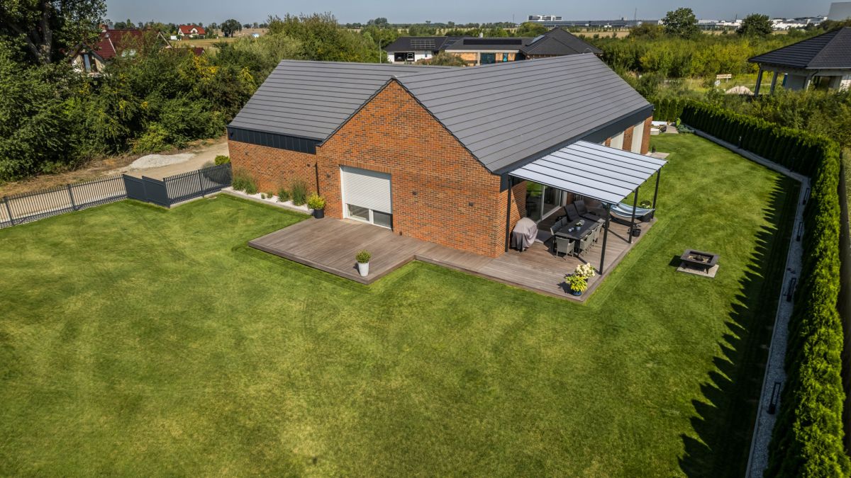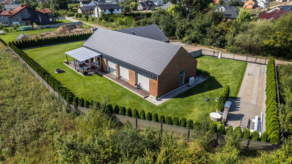 Ogród wyposażony jest w automatyczny system nawadniania zasilany wodą deszczową oraz robota koszącego, co pozwala utrzymać jego estetykę przy minimalnym zaangażowaniu.