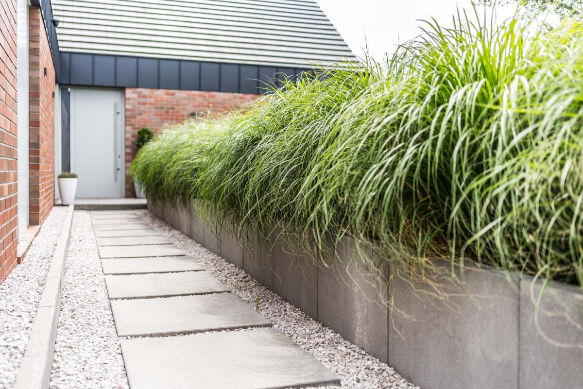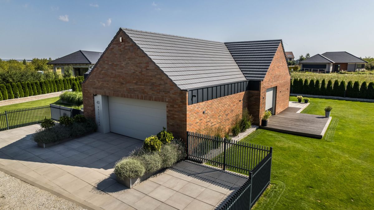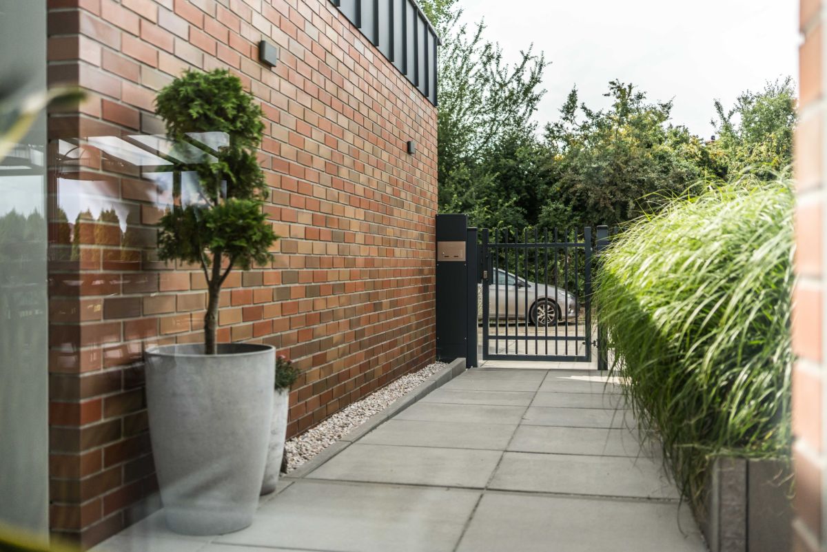 Ogród wyposażony jest w automatyczny system nawadniania zasilany wodą deszczową oraz robota koszącego, co pozwala utrzymać jego estetykę przy minimalnym zaangażowaniu.