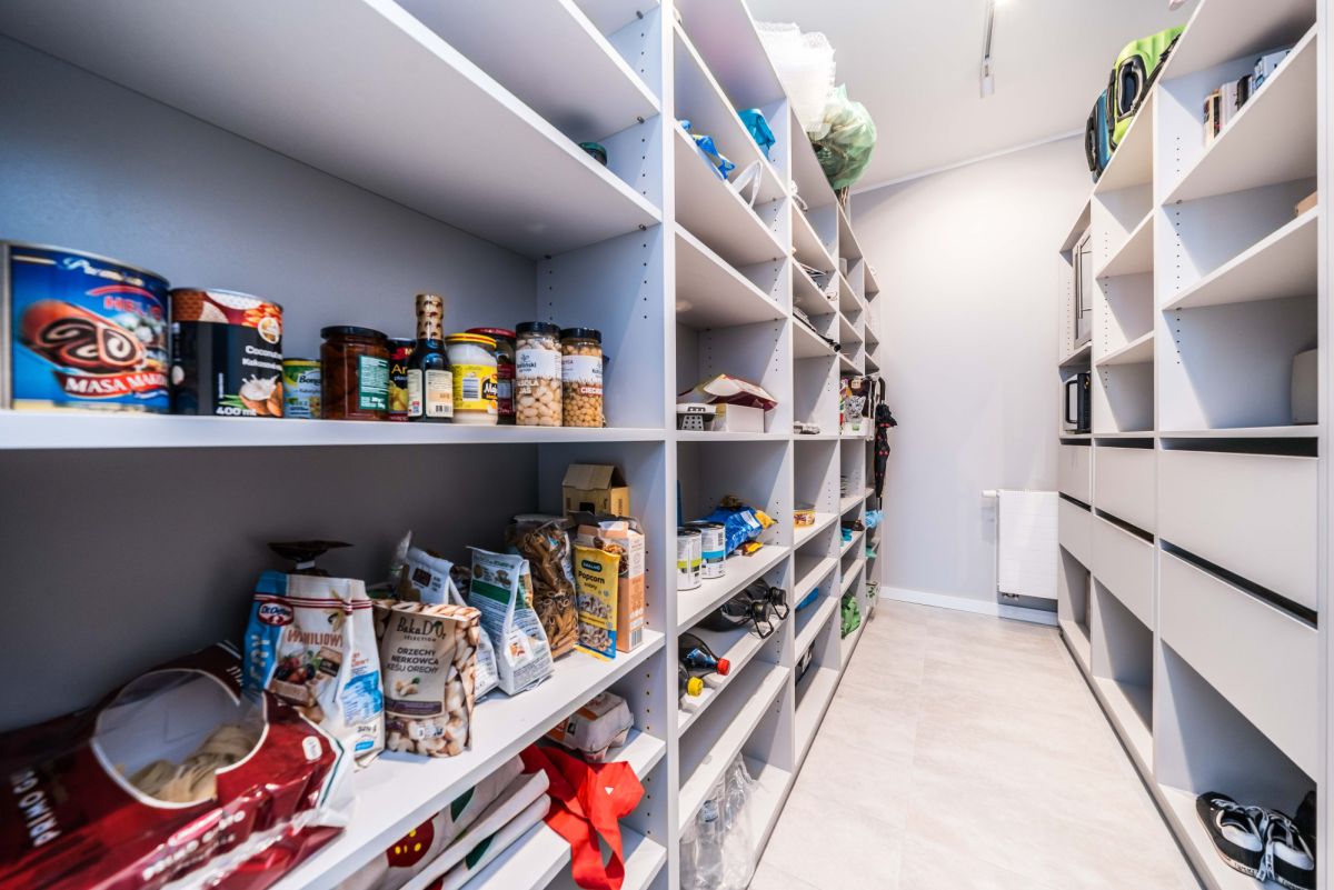 Bezpośrednio za kuchnią znajduje się wejście do przestronnej, w pełni zabudowanej spiżarni.