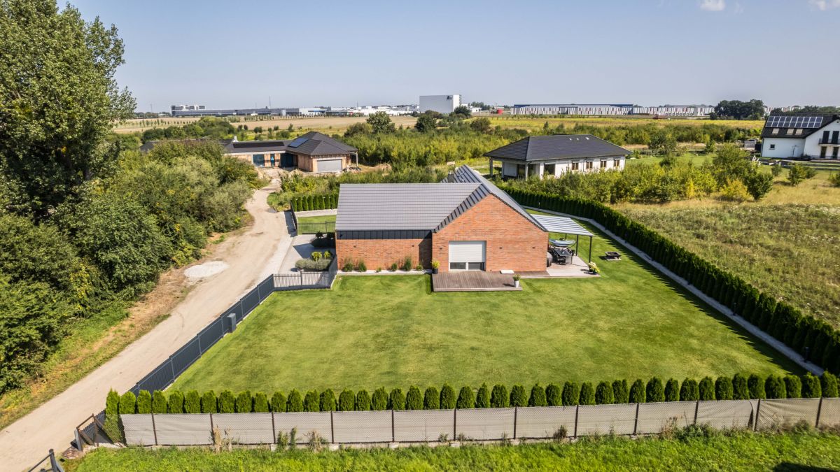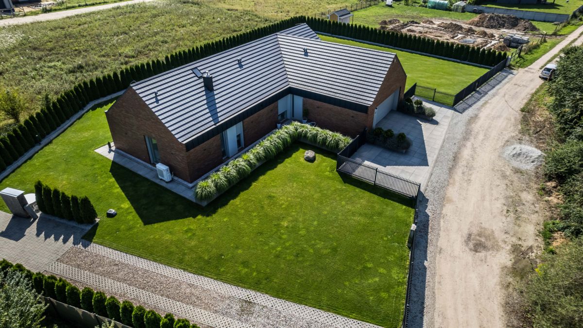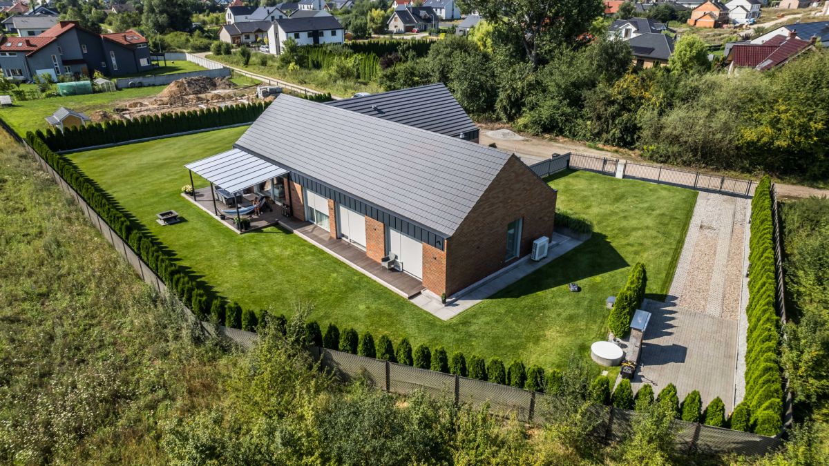 Działka o powierzchni 1823 m² została zagospodarowana w sposób uporządkowany i spójny z architekturą domu. Liczne nasadzenia iglaków budują poczucie prywatności i zielone tło przez cały rok.