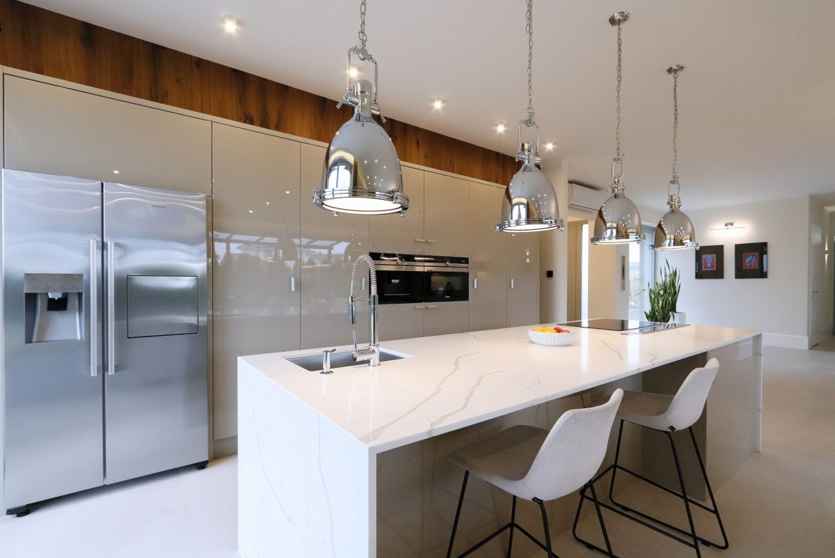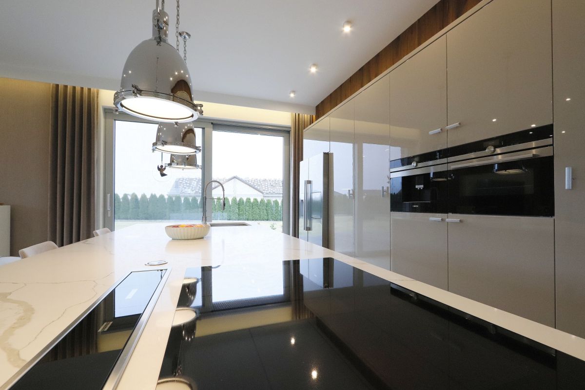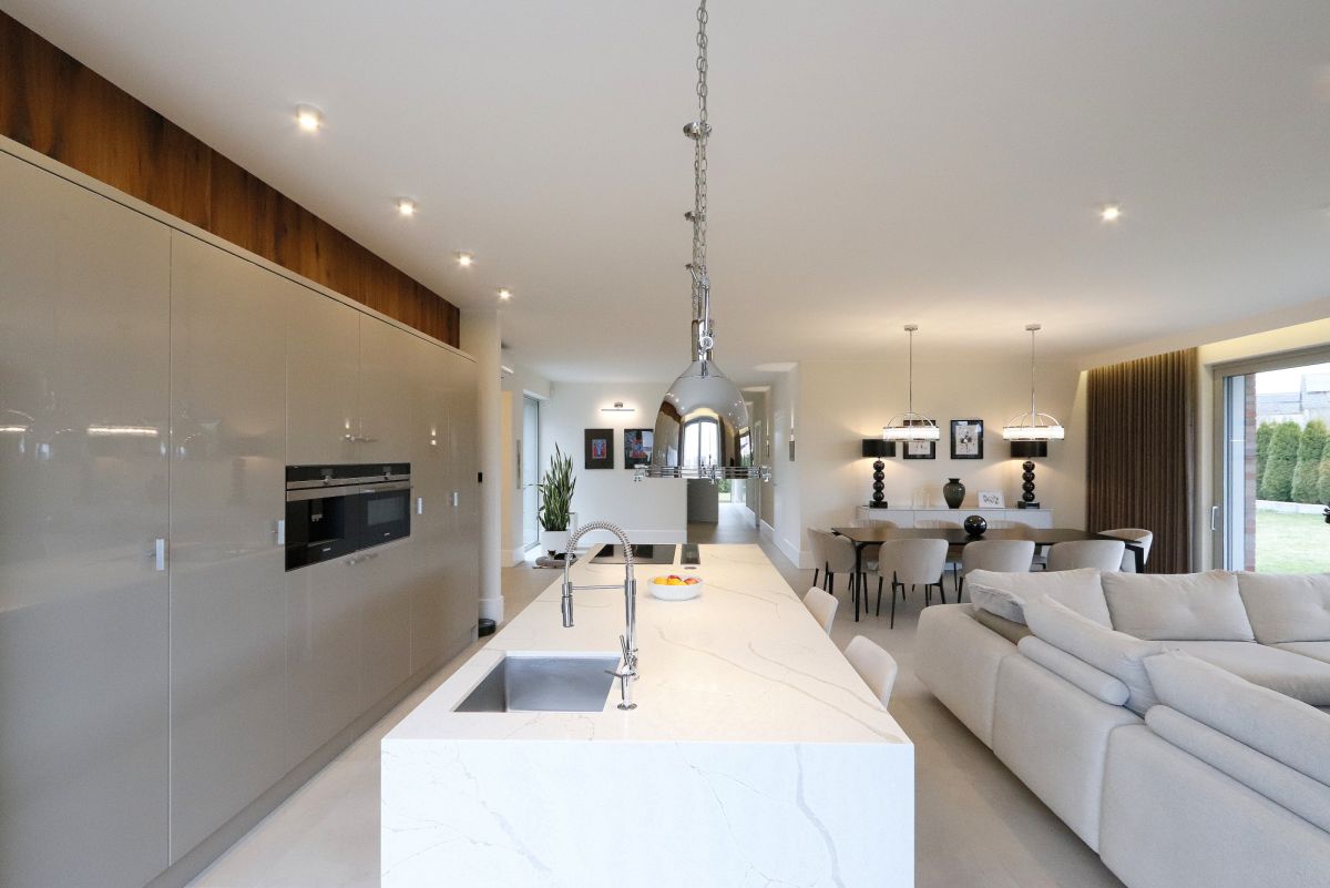 Kuchnia wykonana w bardzo starannej zabudowie stolarskiej na zamówienie, z dużą ilością miejsca do przechowywania oraz wysokiej klasy sprzętem AGD, została harmonijnie wpisana w całość przestrzeni dziennej. Duża wyspa kuchenna pełni również funkcję wygodnego blatu roboczego, zapewniając komfort codziennego użytkowania, a jednocześnie subtelnie organizuje układ, oddzielając ją od pozostałej części tej przestrzeni.