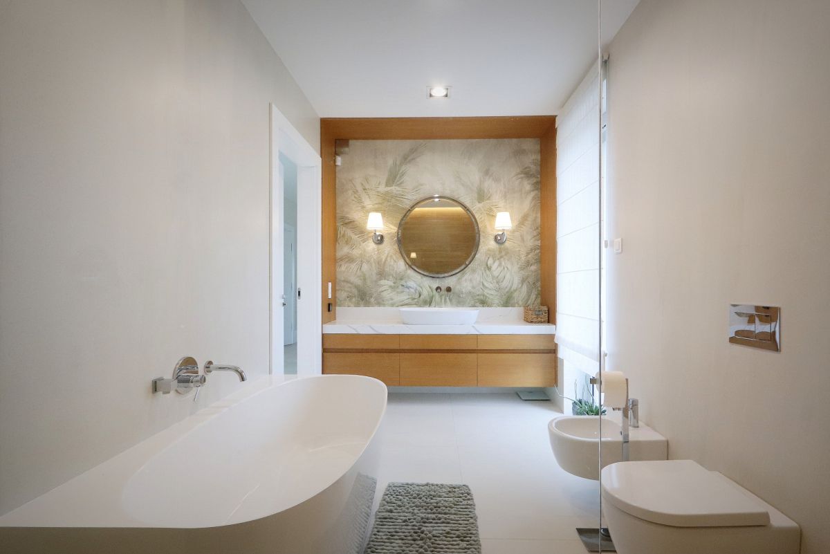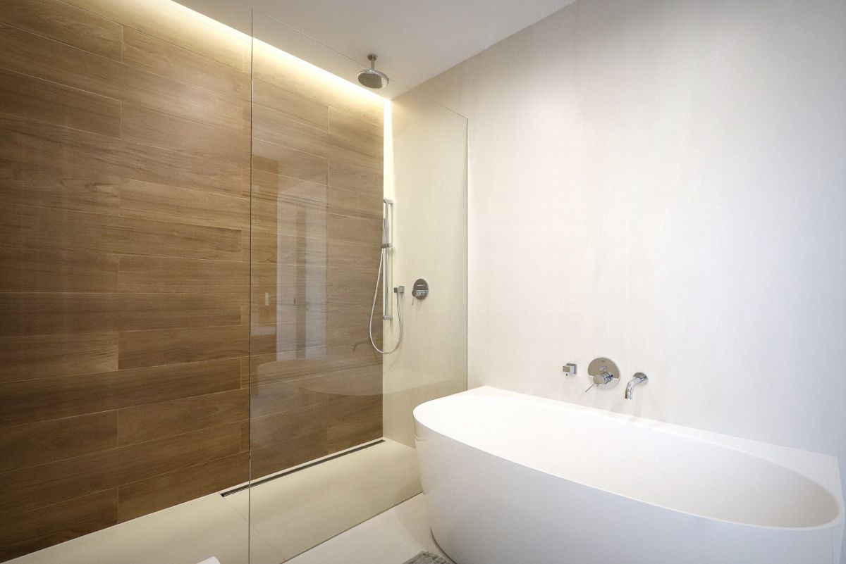 Łazienka o powierzchni blisko 10 m² została zaprojektowana w eleganckim, ponadczasowym stylu — z wanną, prysznicem i WC.