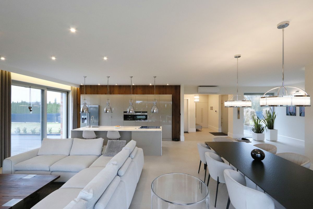 Wejście prowadzi przez reprezentacyjny hol do otwartej strefy dziennej, w której wszystkie funkcje zostały logicznie i estetycznie połączone.