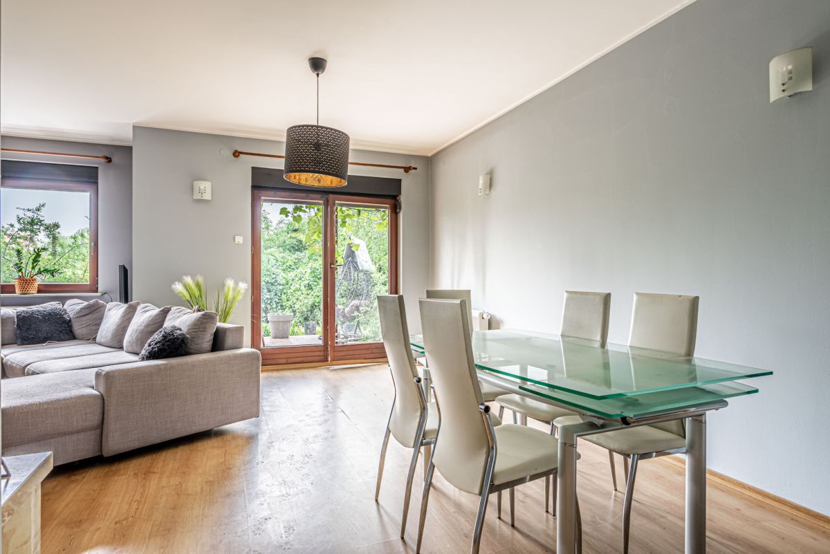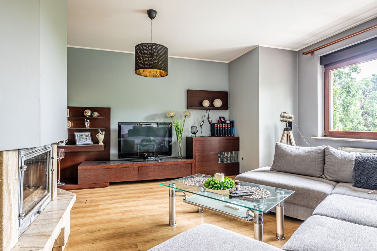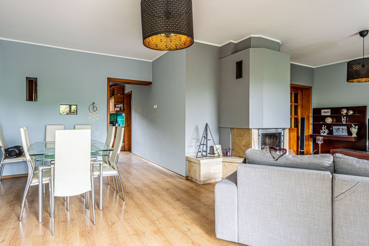 • Salon ok. 34 m² z kominkiem i wyjściem na taras oraz do ogrodu