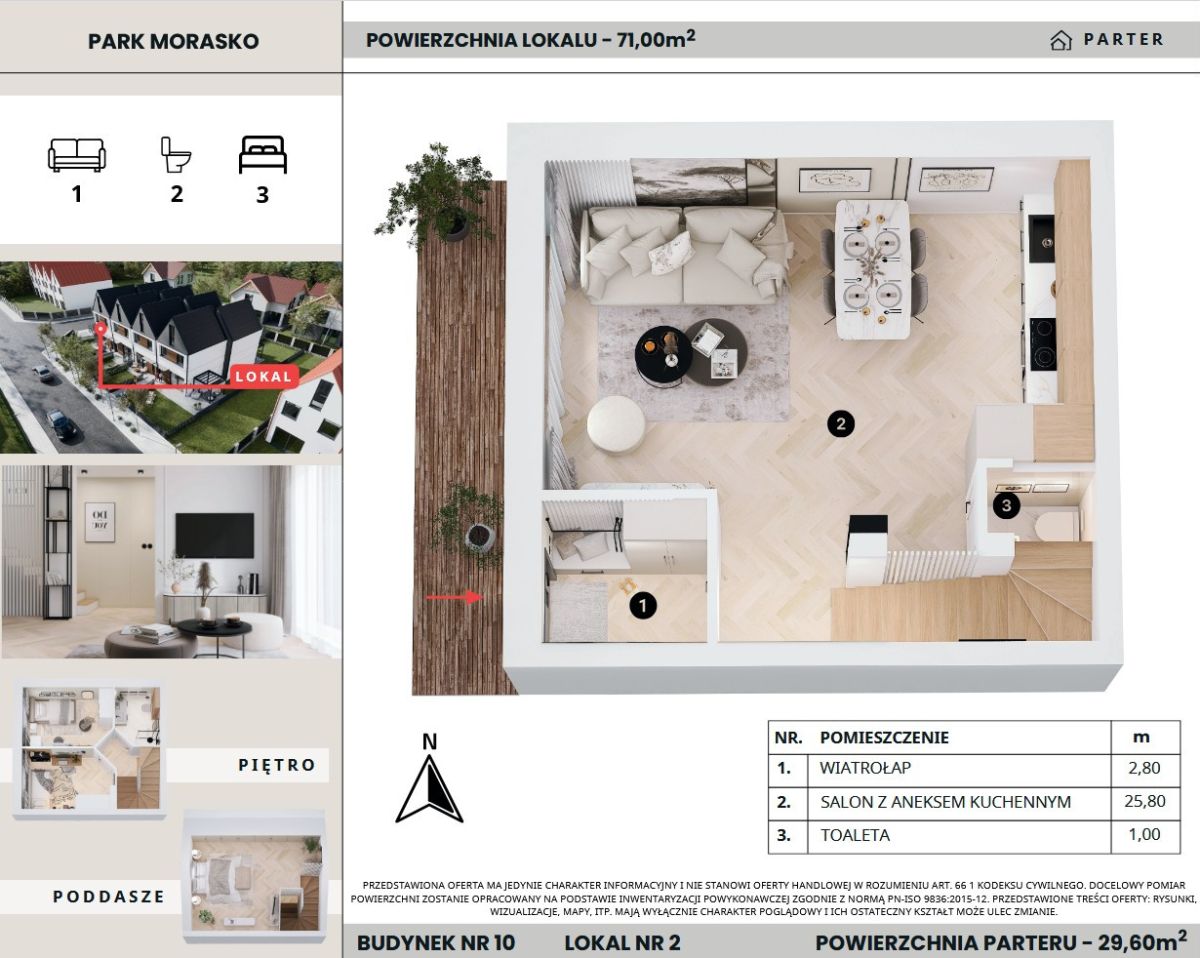 Wizualizacje budynku, lokali i zagospodarowanie terenu mają charakter poglądowy. Przedstawione elementy w szczególności mała architektura (np. pergole, wystrój wnętrz, zieleń oraz aranżacje, nie stanowią oferty w rozumieniu art. 22 par.1 KC ani zapewnienia w rozumieniu art.22 ust.2 ustawy deweloperskiej. Zakres i standard inwestycji określony jest wyłącznie w prospekcie informacyjnym i umowie deweloperskiej.