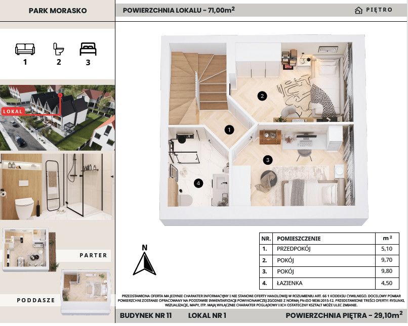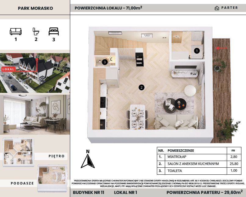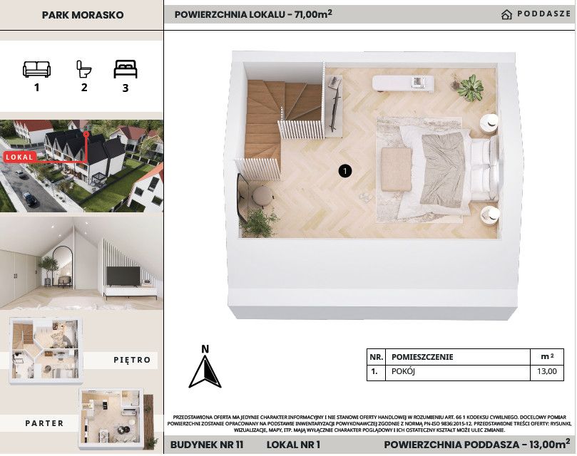 Wizualizacje budynku, lokali i zagospodarowanie terenu mają charakter poglądowy. Przedstawione elementy w szczególności mała architektura (np. pergole, wystrój wnętrz, zieleń oraz aranżacje, nie stanowią oferty w rozumieniu art. 22 par.1 KC ani zapewnienia w rozumieniu art.22 ust.2 ustawy deweloperskiej. Zakres i standard inwestycji określony jest wyłącznie w prospekcie informacyjnym i umowie deweloperskiej.