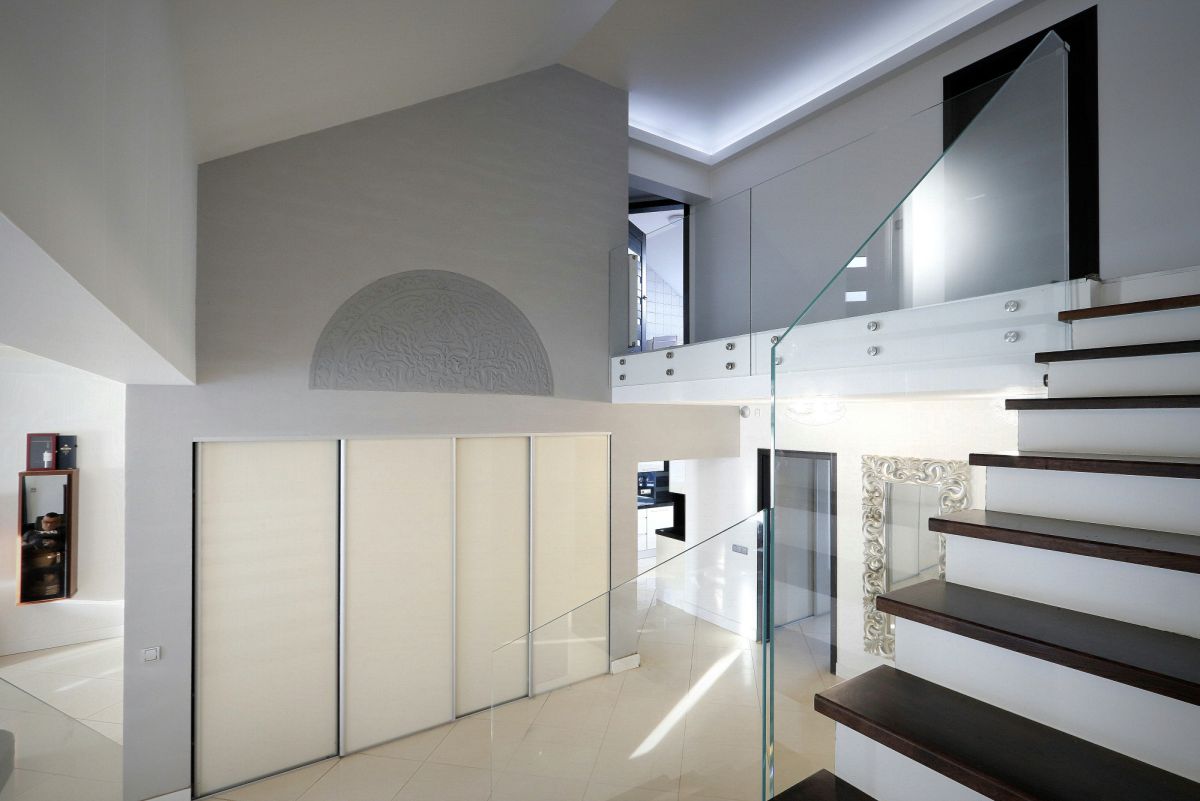 Dom wyróżnia się nowoczesnym, otwartym układem wnętrz, dużą ilością naturalnego światła i wyraźnym poczuciem przestrzeni. Wysoki salon z antresolą, szklane balustrady i płynne przejście między strefami dziennymi nadają całości elegancki, współczesny charakter.