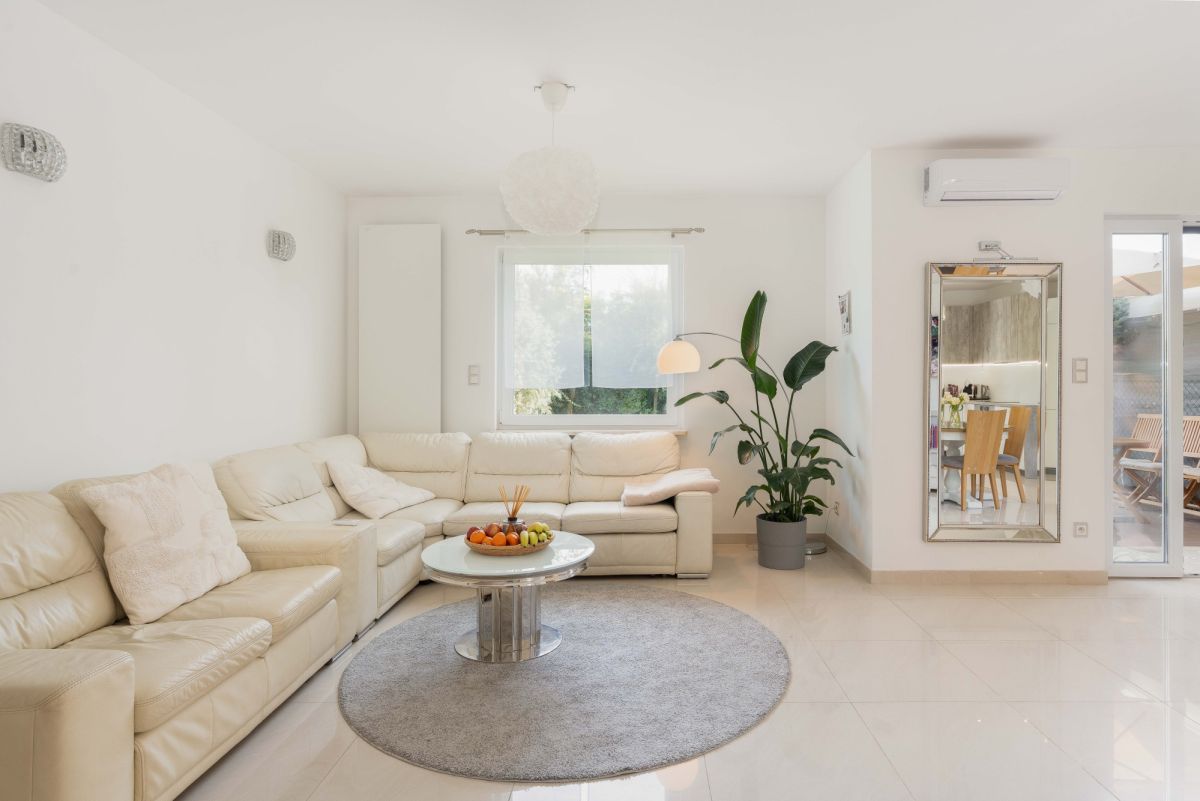 • Salon z telewizorem, sofą i fotelami skórzanymi, stół i cztery krzesła,