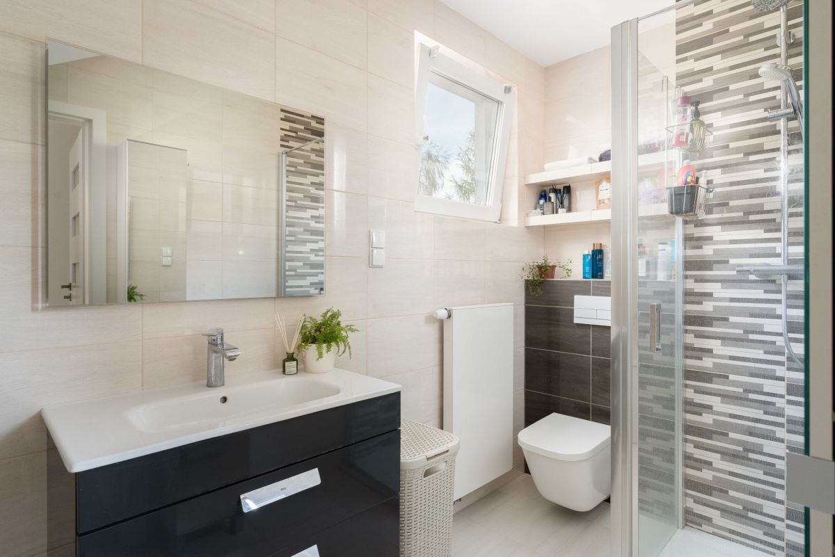 • Łazienka z prysznicem, wanną, WC, umywalka, klasy kafelki na podłodze i na ścianach.