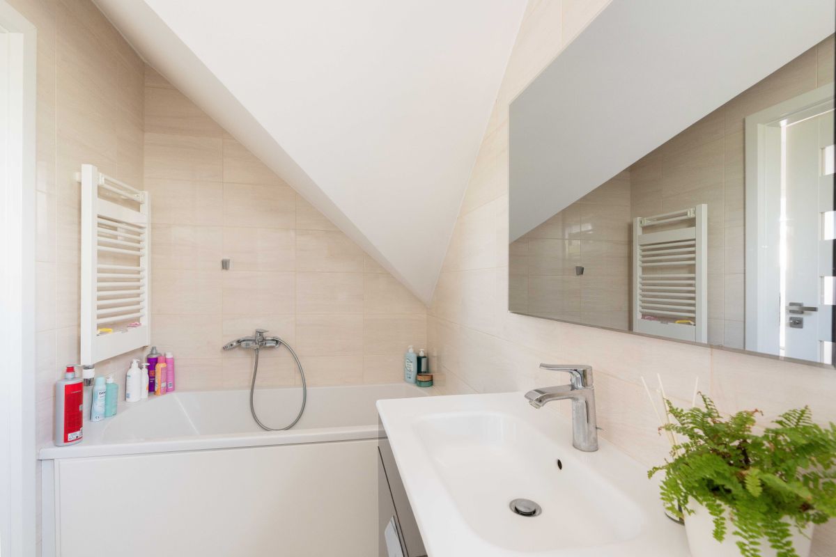 Część dzienna zlokalizowana na parterze, z wyjściem do ogrodu, składa się: z dużego salonu połączonego z otwartą kuchnią z oknem, łazienki z WC oraz wiatrołapu. Na piętrze znajduje się część prywatna obejmująca (3)trzy sypialnie oraz łazienkę z wanną.