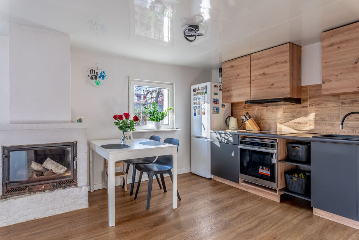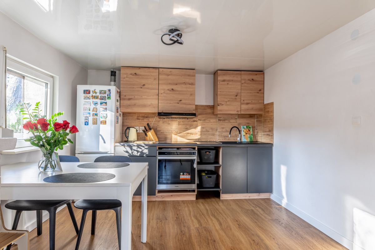 Kuchnia w zabudowie, wyposażona w lodówkę , okap, piekarnik,, płyta indukcyjna.