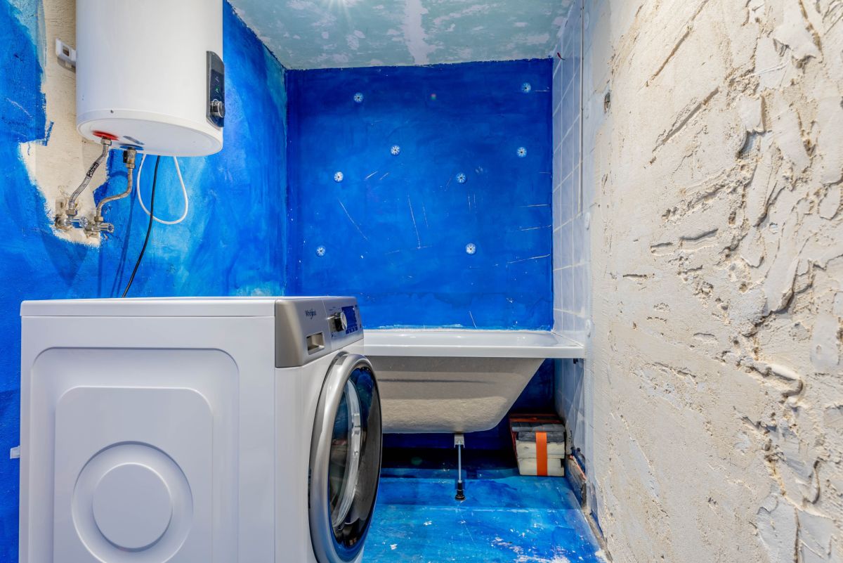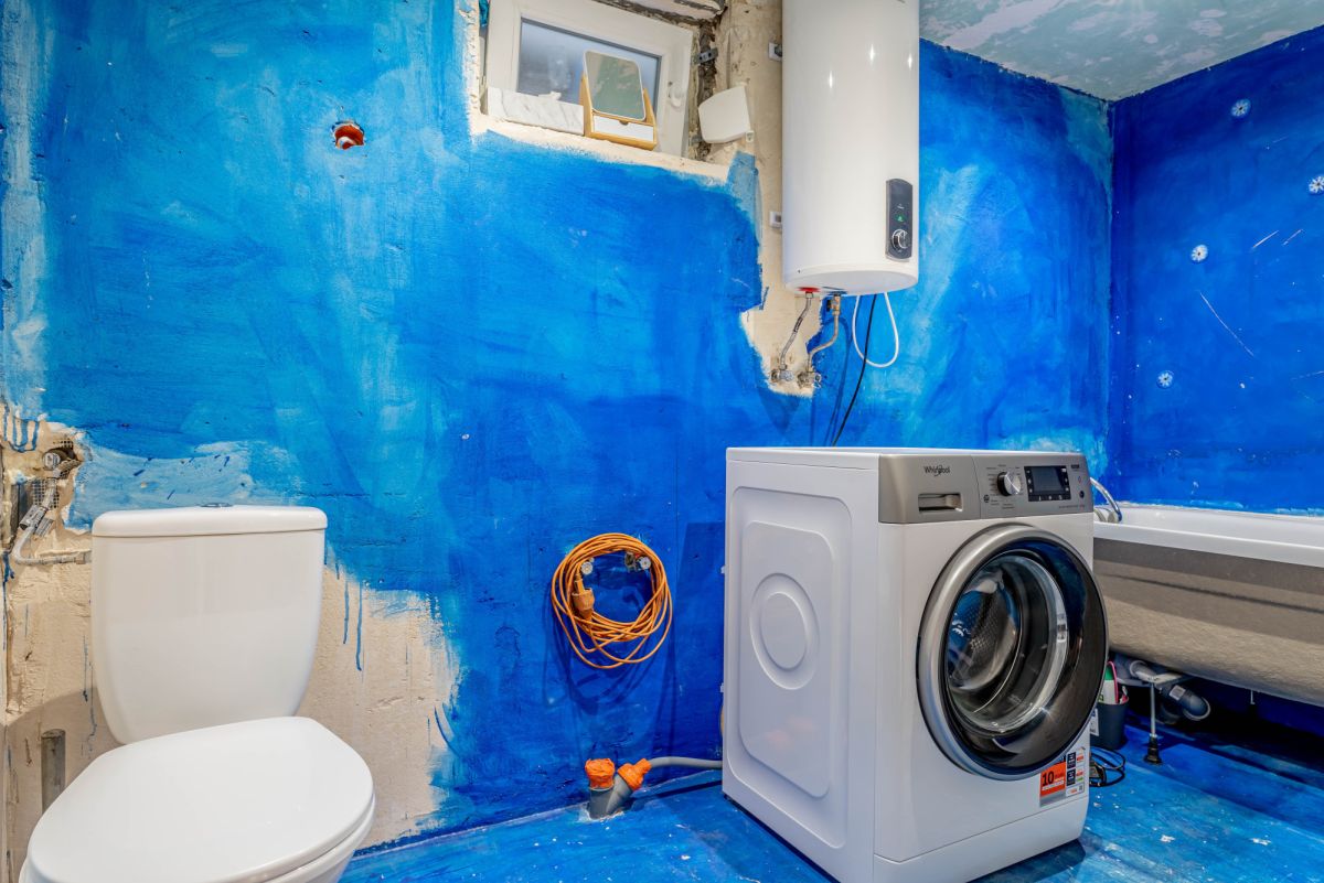 Łazienka do remontu, z wanną i pralką.