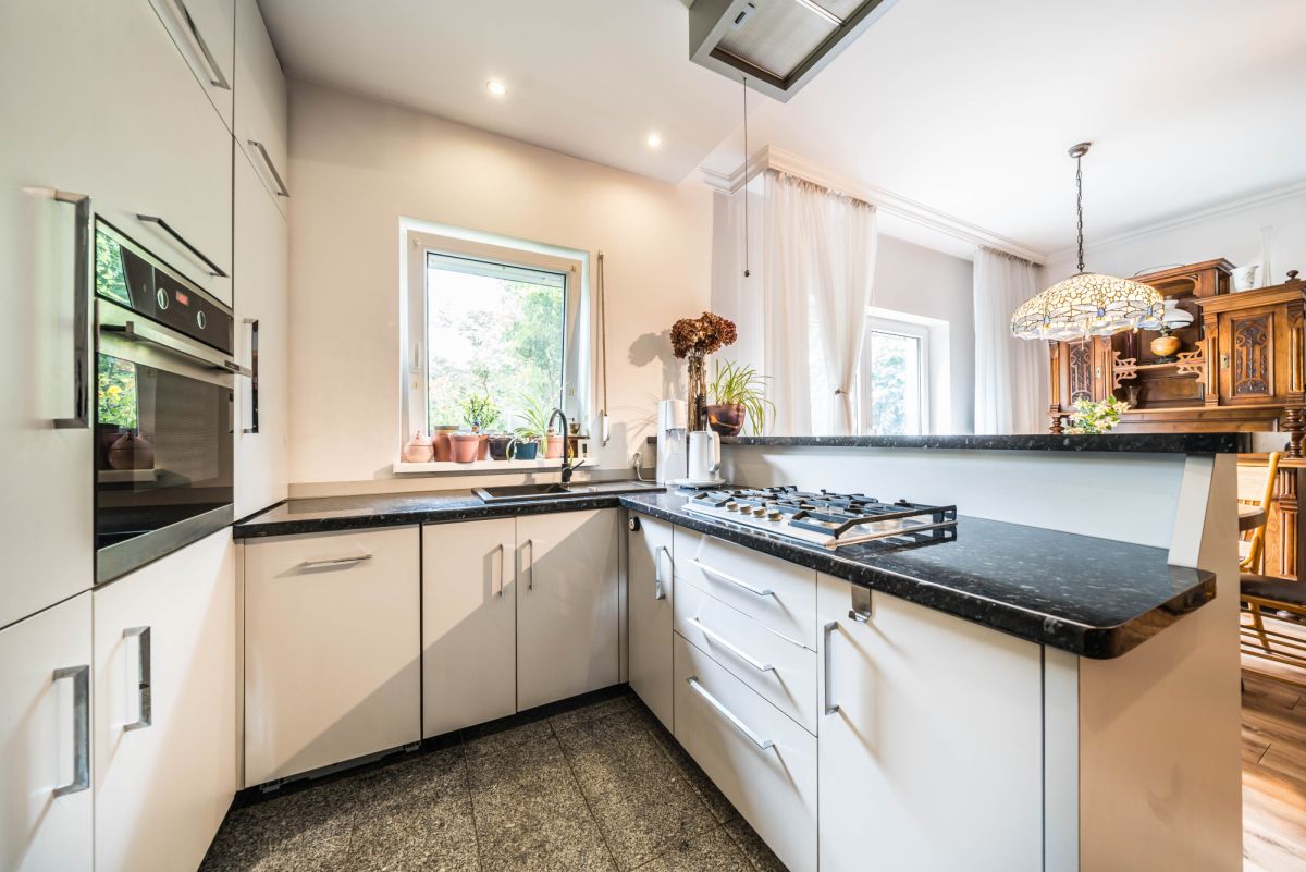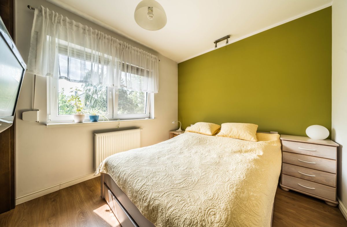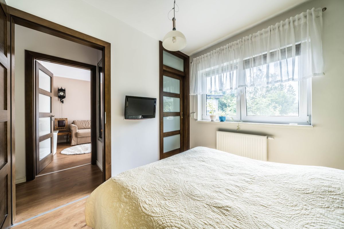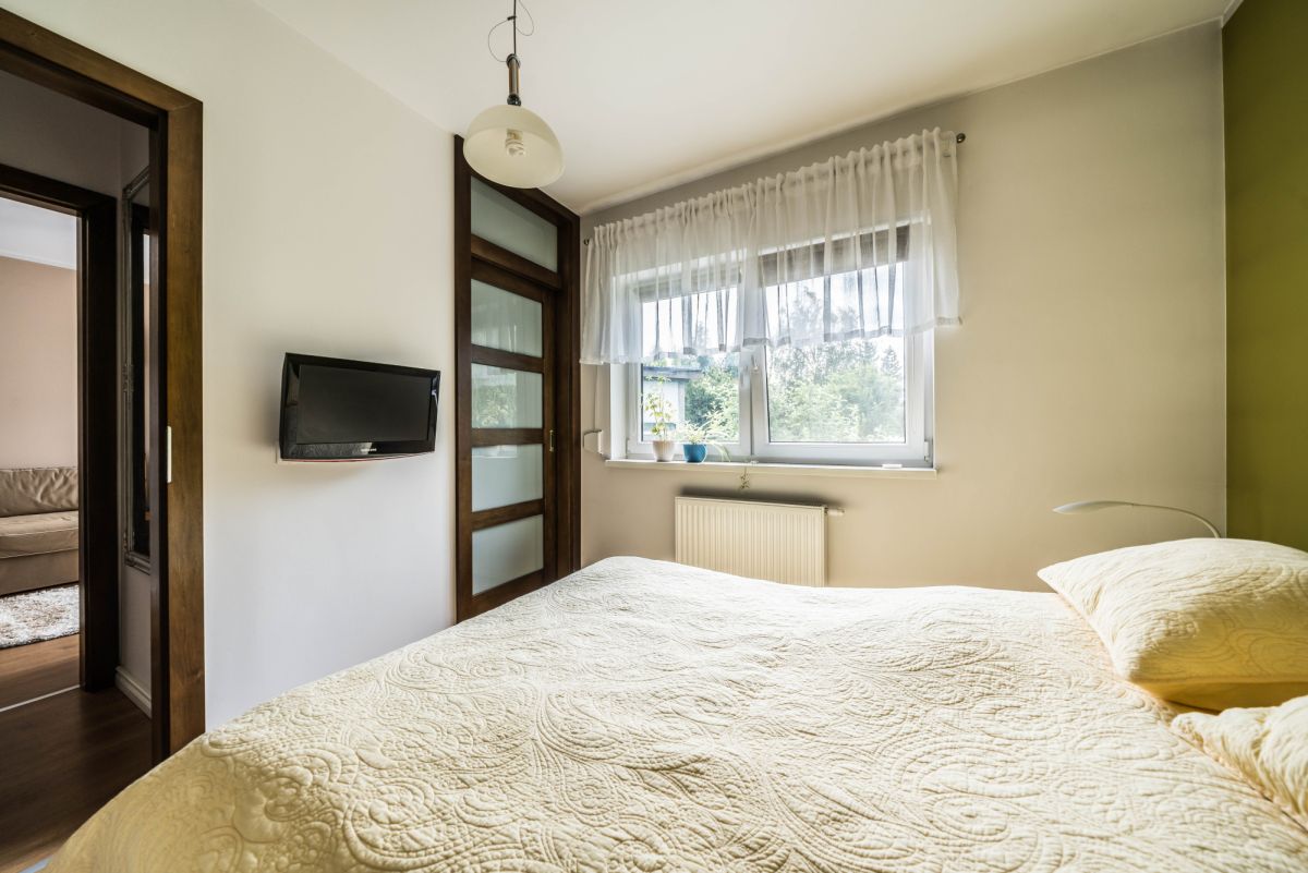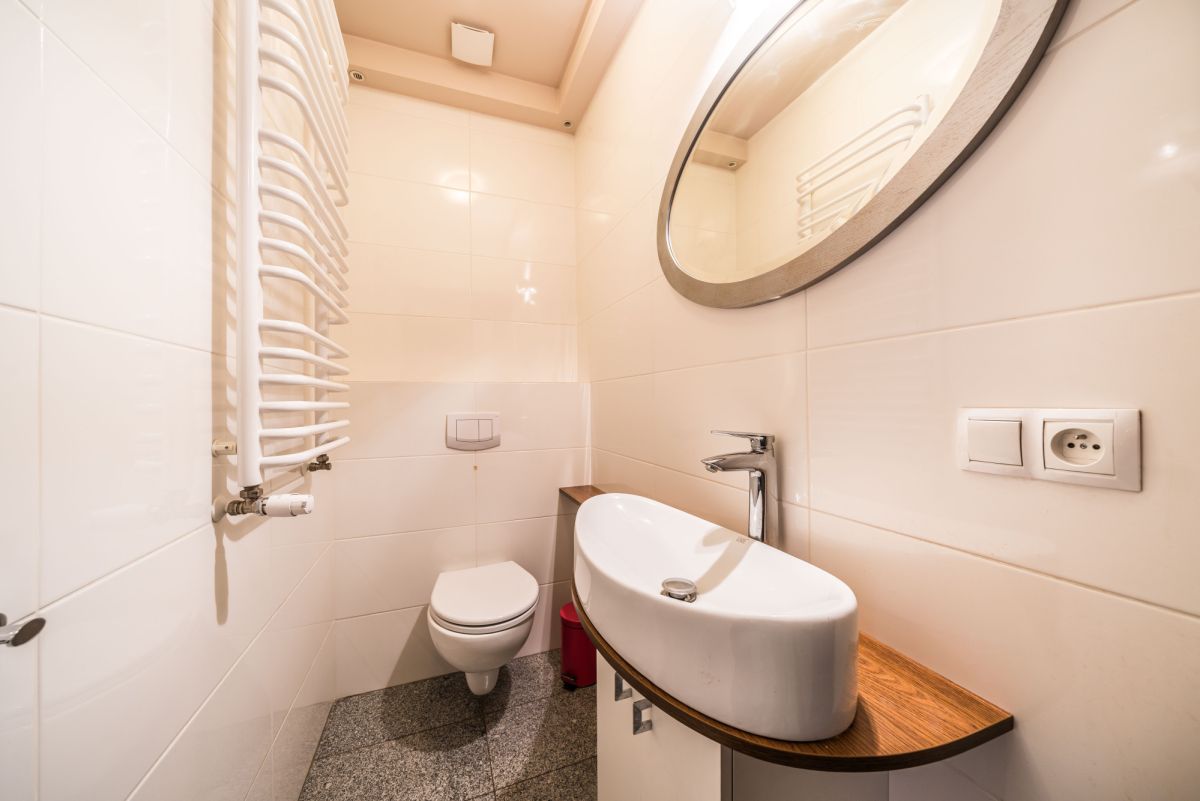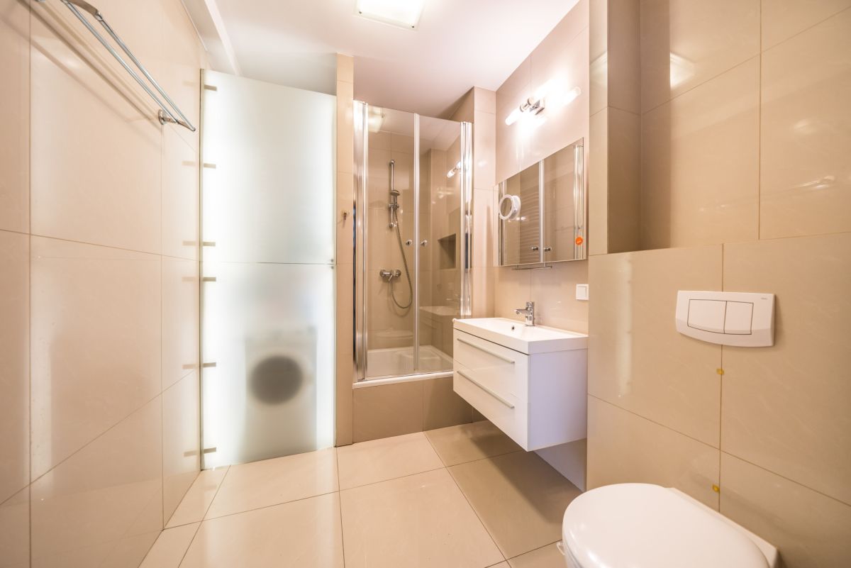 • przestronna łazienka z kabiną prysznicową i zabudowaną pralką