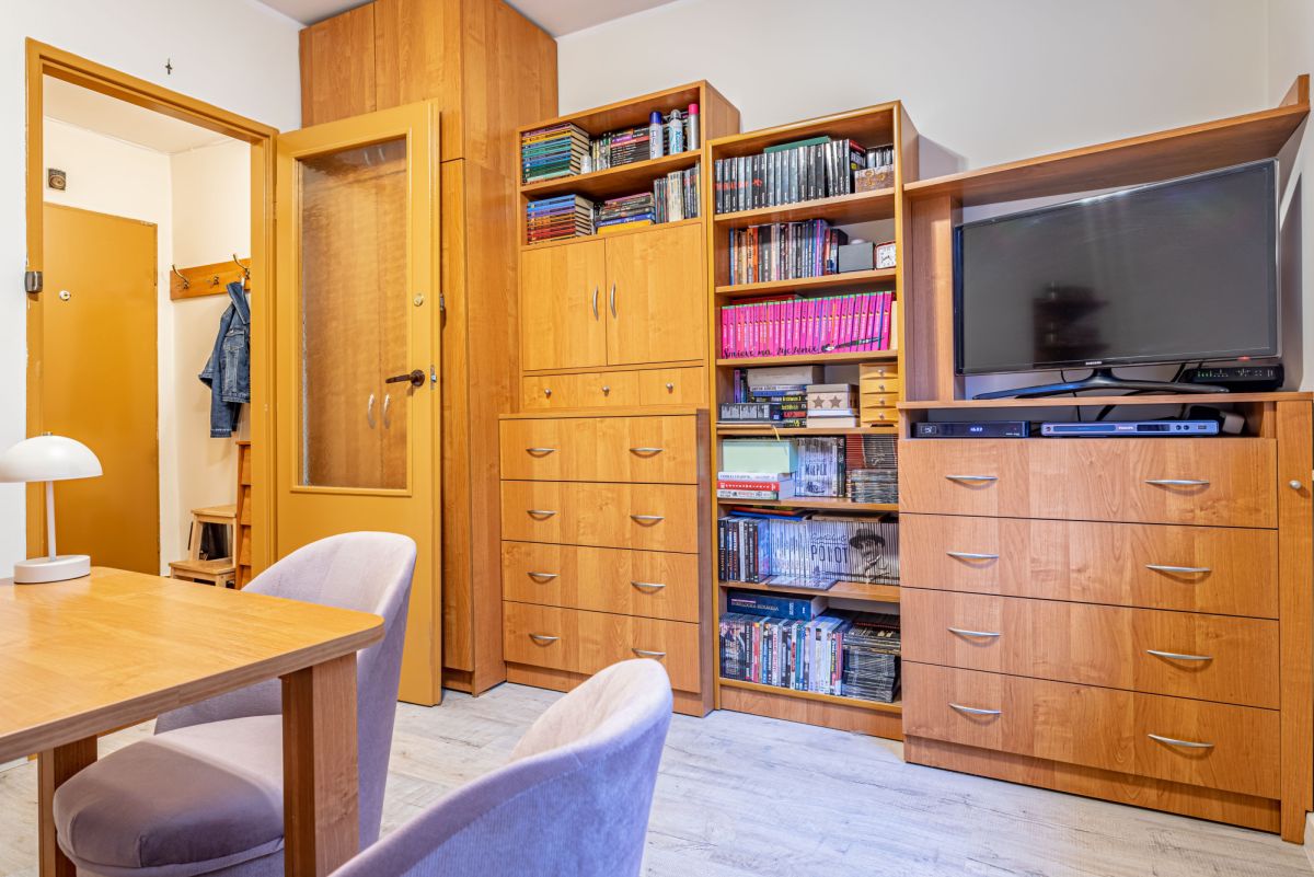 Pokój dzienny - wygodna, rozkładana kanapa z pojemnikiem na pościel, meble na wymiar.