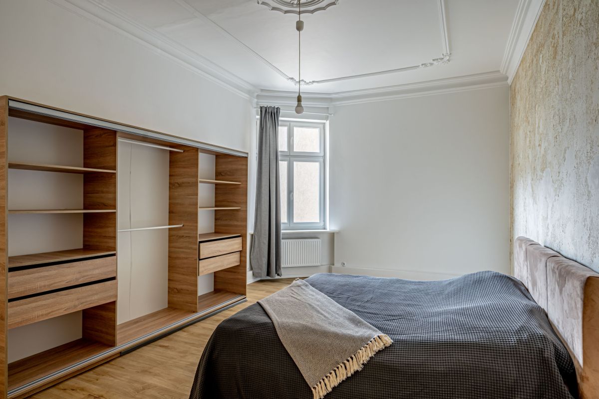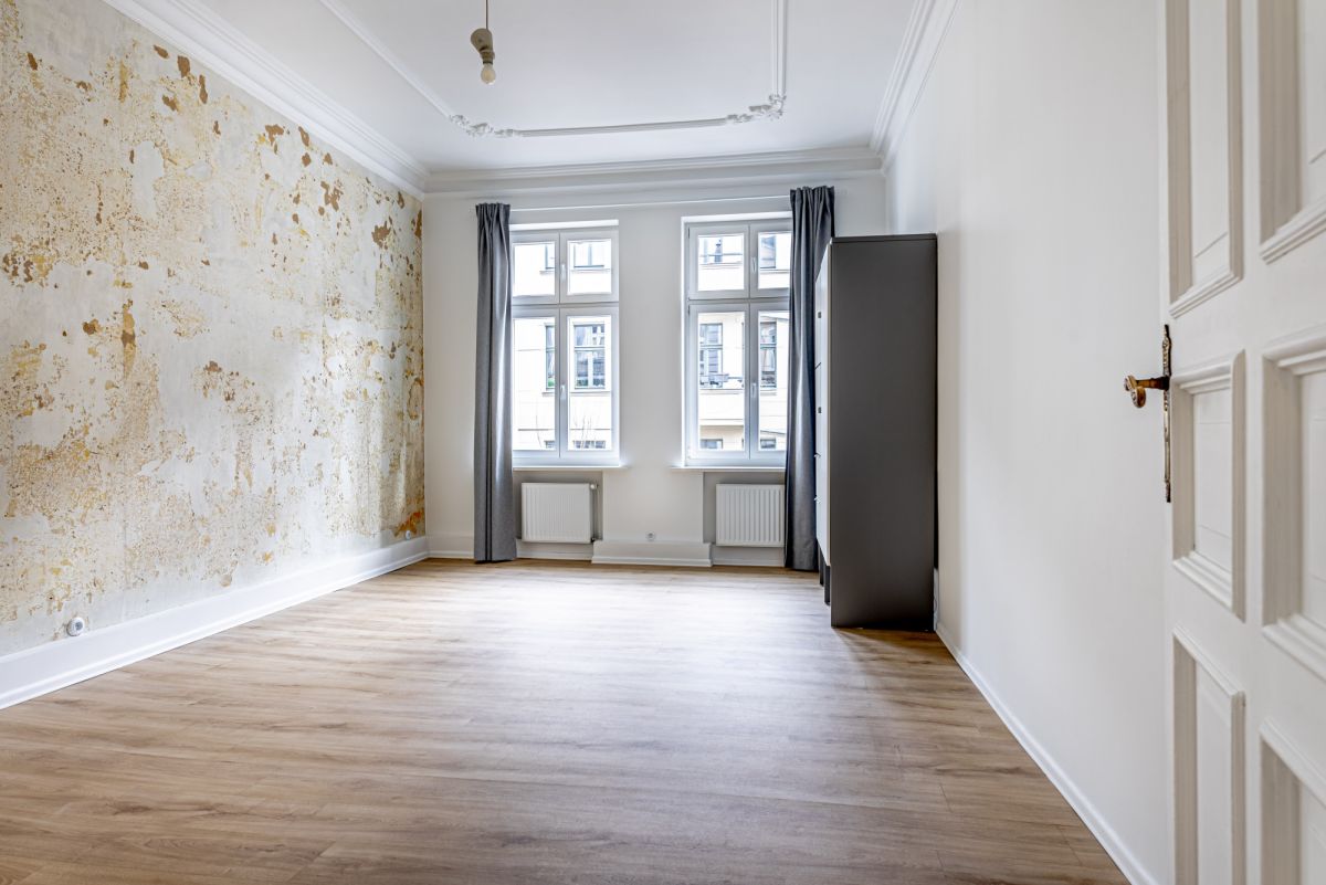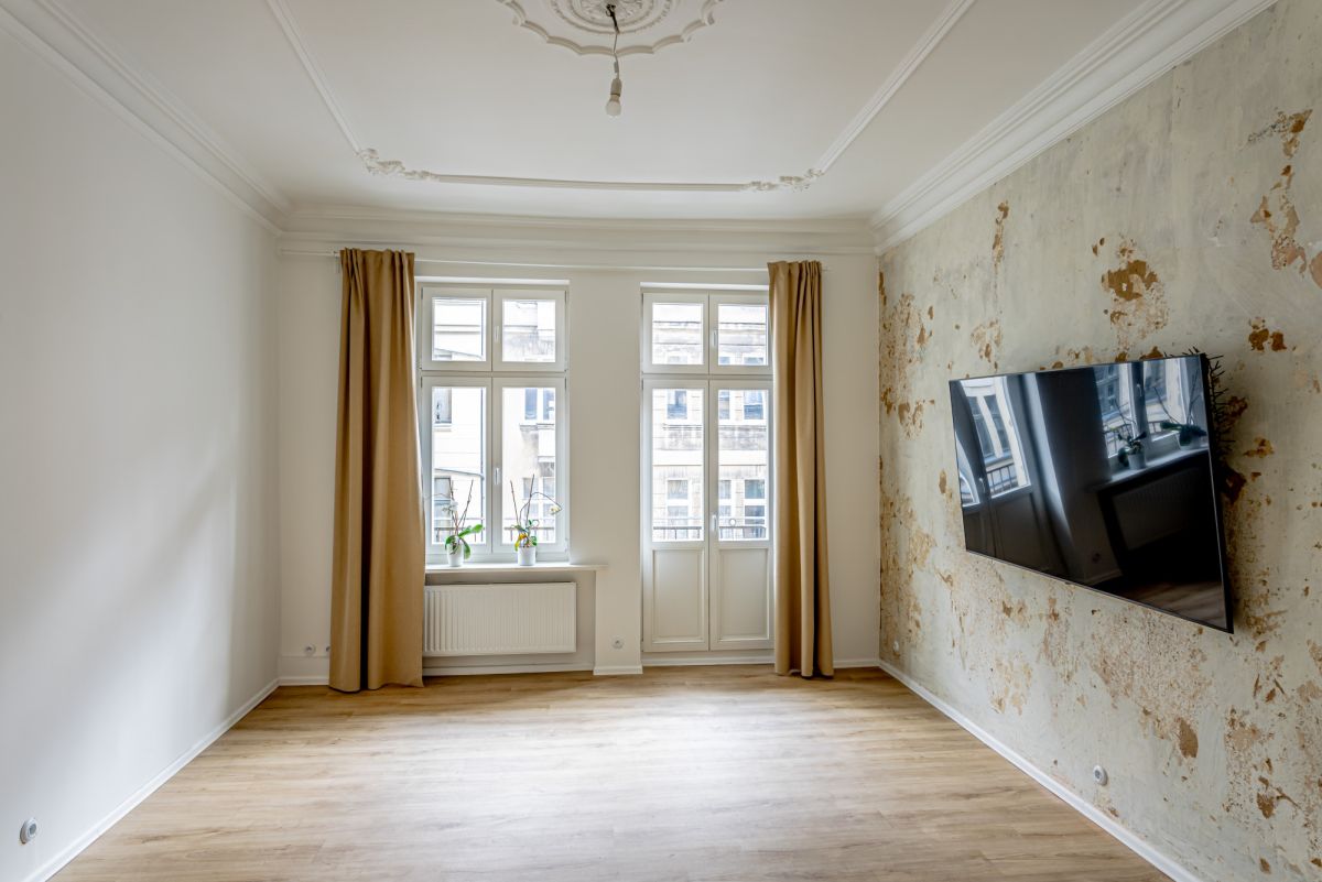 Po prawej stronie znajduje się przestronny, dobrze doświetlony salon z wyjściem na balkon. Wysokie okna, klasyczne proporcje i zachowane detale sufitowe nadają tej części wyraźny, kamieniczny charakter.