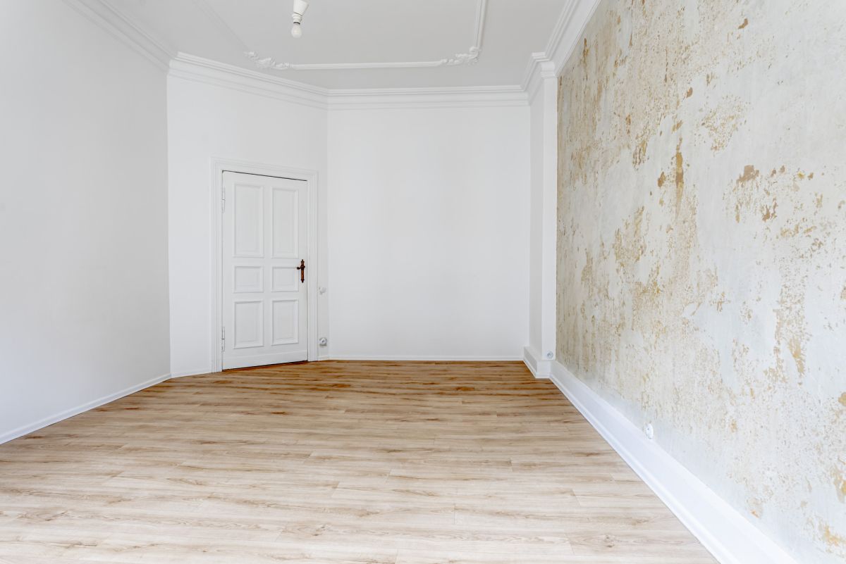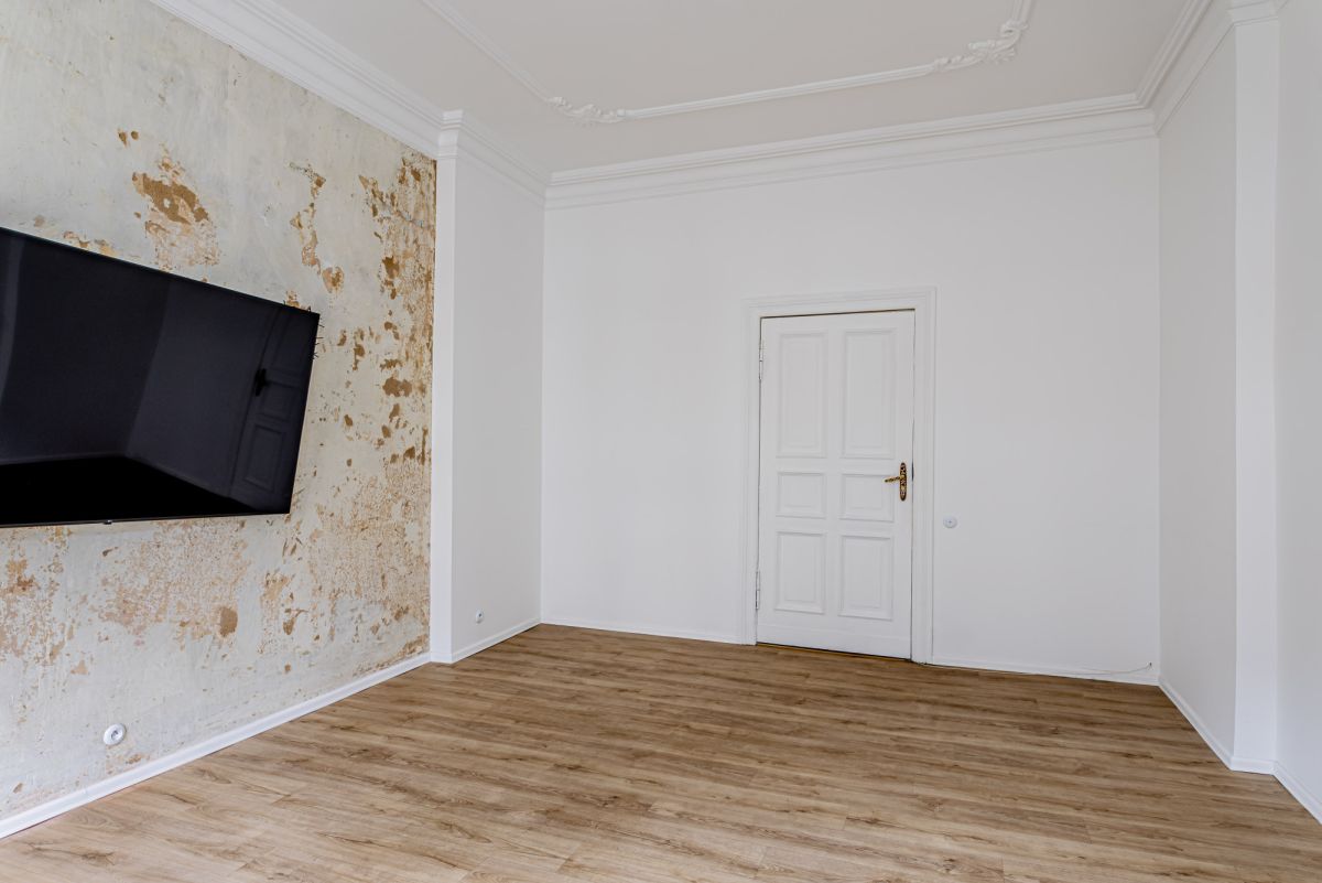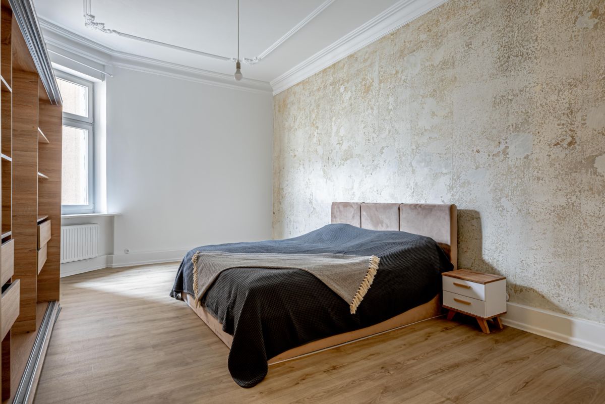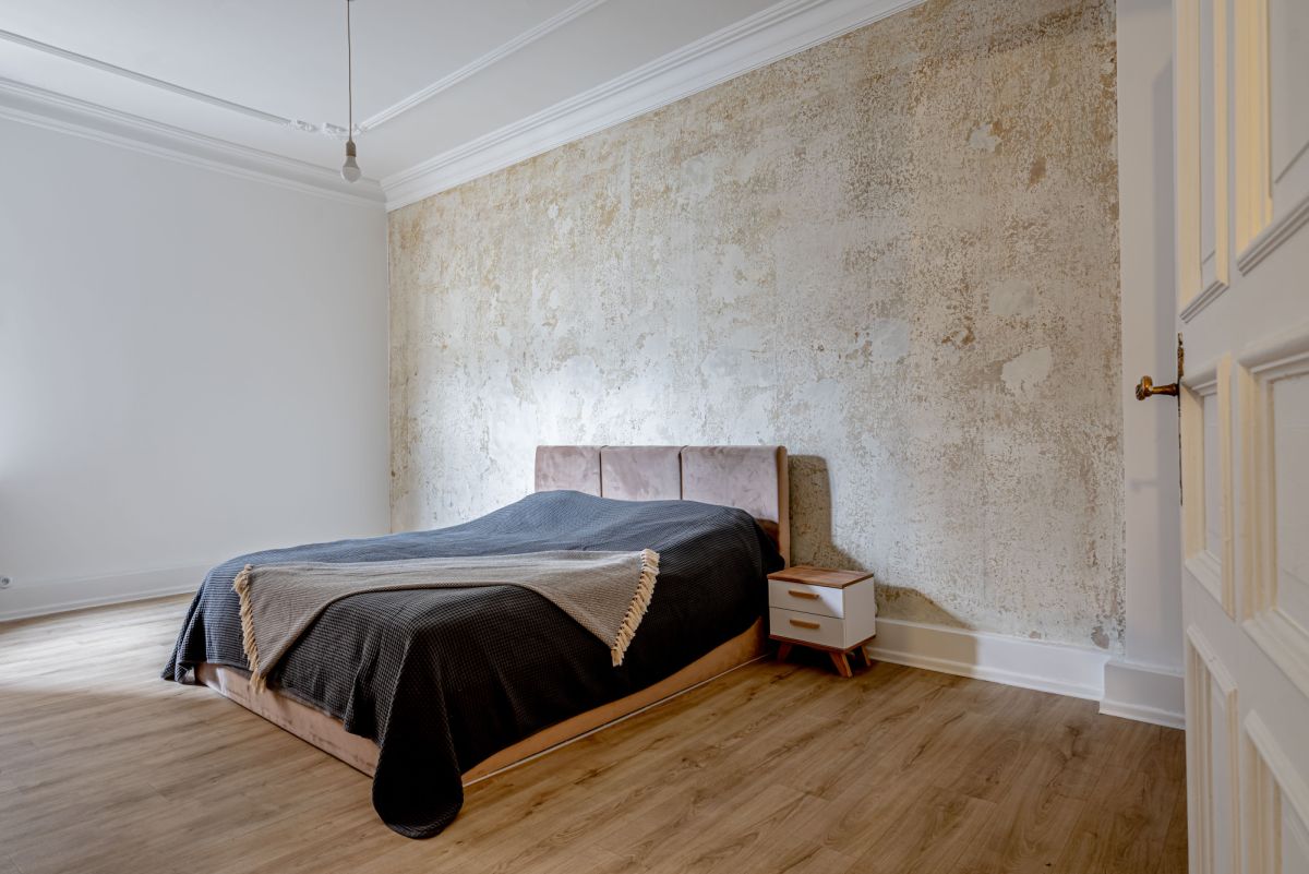 Zachowane zostały detale typowe dla kamienic — wysokie sufity, dekoracyjne elementy sztukaterii oraz proporcje pomieszczeń. Ściany wykończone są w części tynkami strukturalnymi, które nadają wnętrzu naturalnej faktury i głębi.