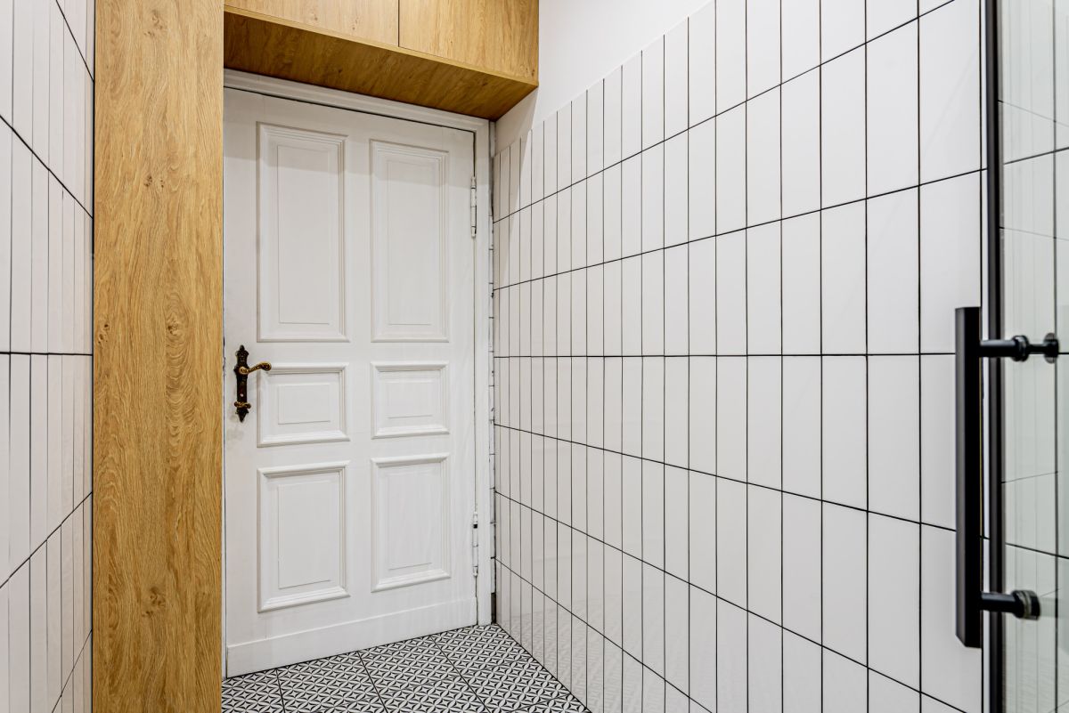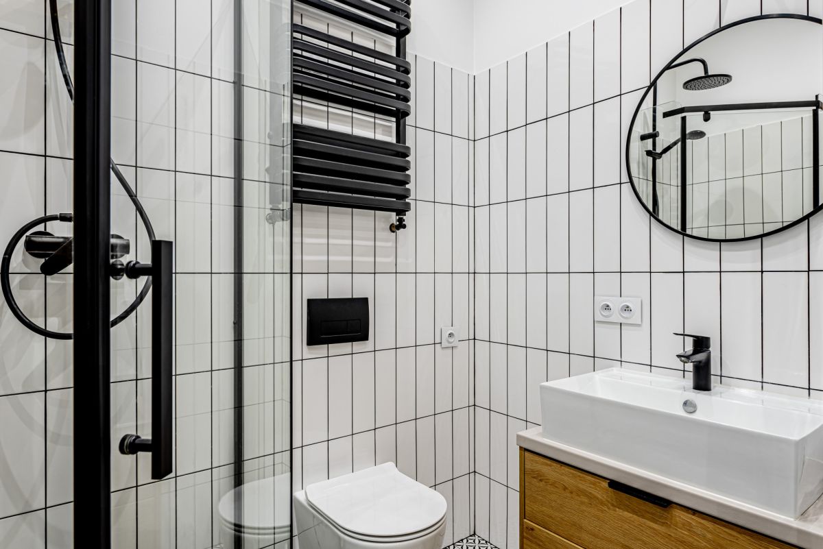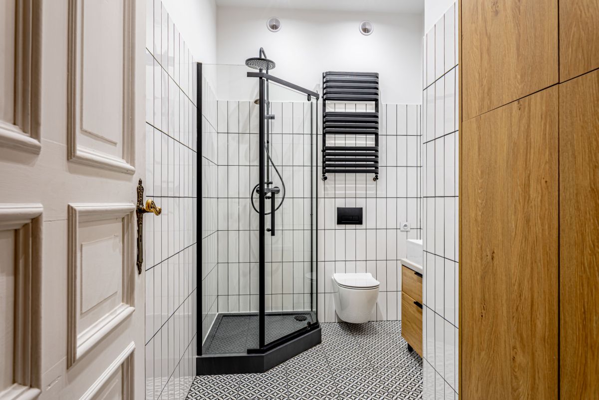 Bezpośrednio przy wejściu do mieszkania znajduje się łazienka po świeżym remoncie — z prysznicem i zabudową zapewniającą wygodne przechowywanie.