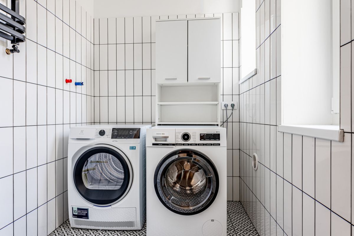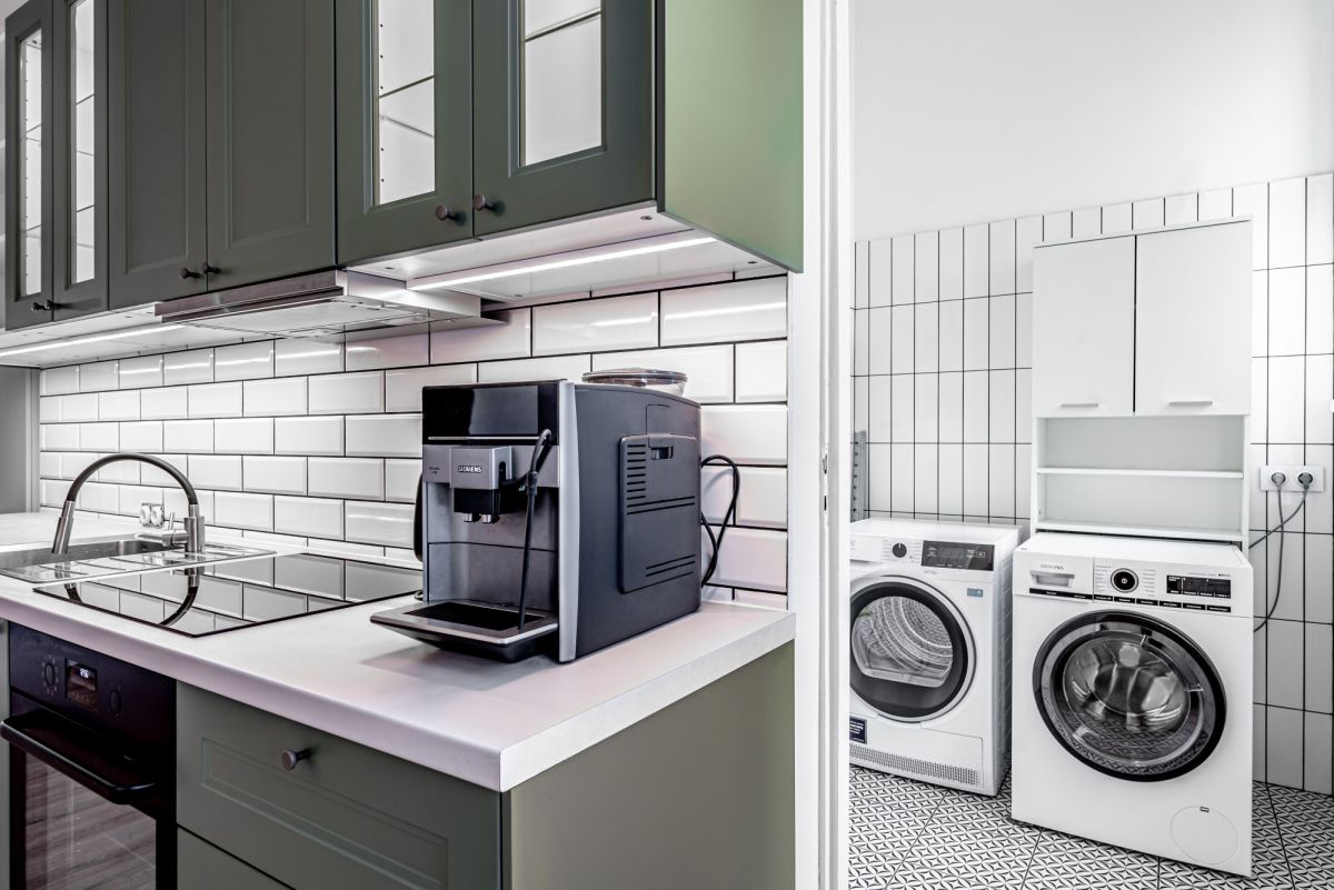 Po lewej stronie zlokalizowana jest duża kuchnia z nowoczesną zabudową, oferująca wygodną przestrzeń do codziennego użytkowania. W jej głębi wydzielono dodatkowe pomieszczenie — z miejscem na pralkę i suszarkę — które może również pełnić funkcję spiżarni lub zaplecza gospodarczego.