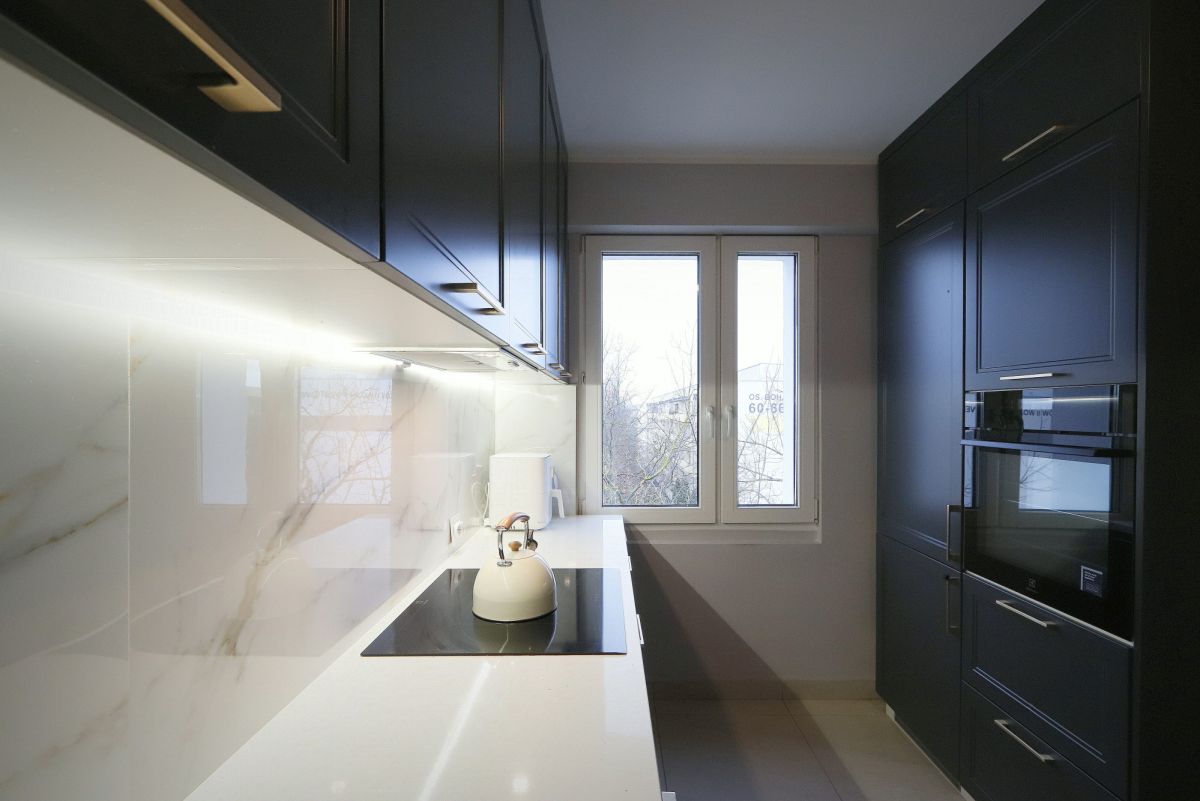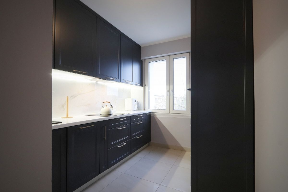 Kuchnia oddzielna, z elegancką zabudową i pełnym wyposażeniem (m.in. zmywarka, płyta, piekarnik). Zachowana została w spójnym, nowoczesnym stylu.
