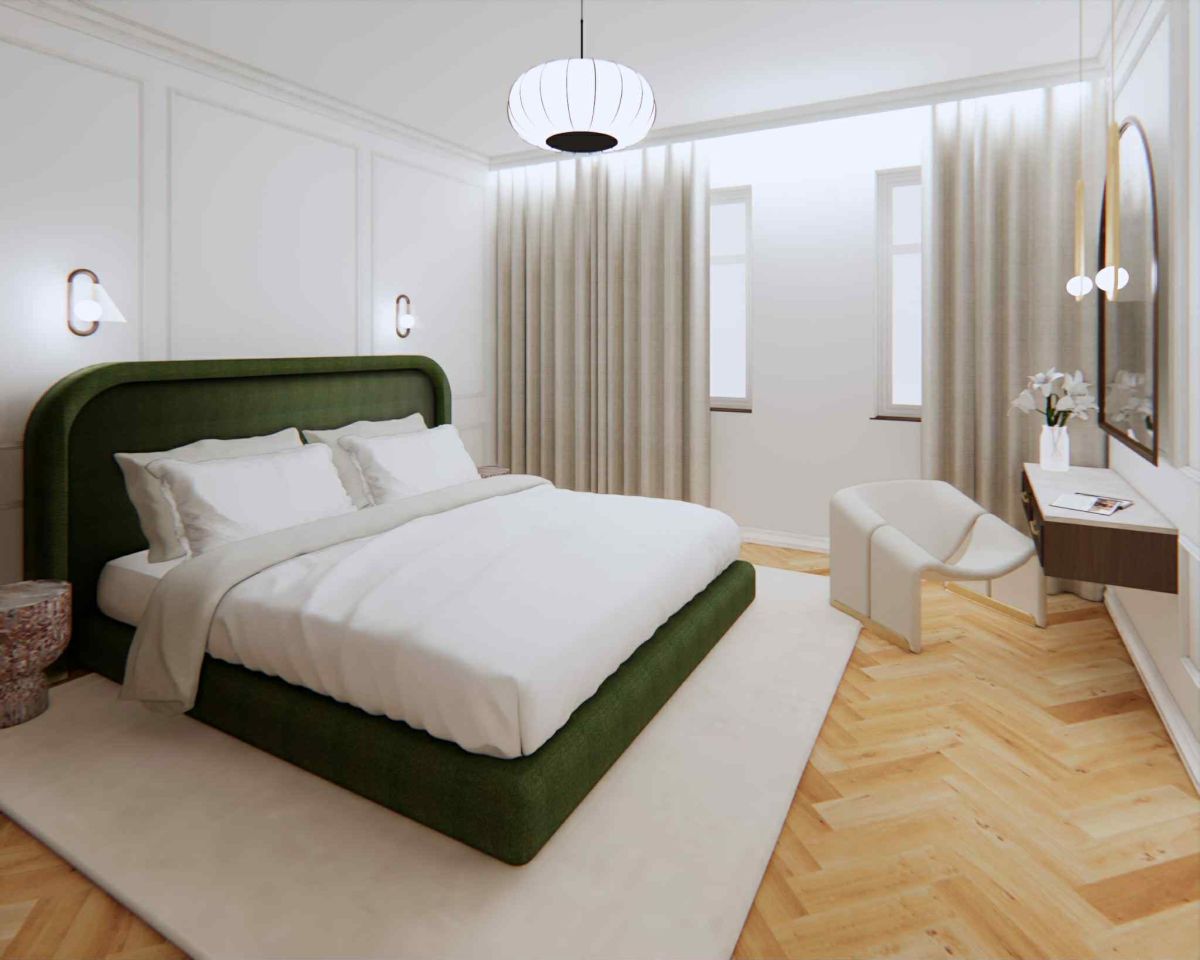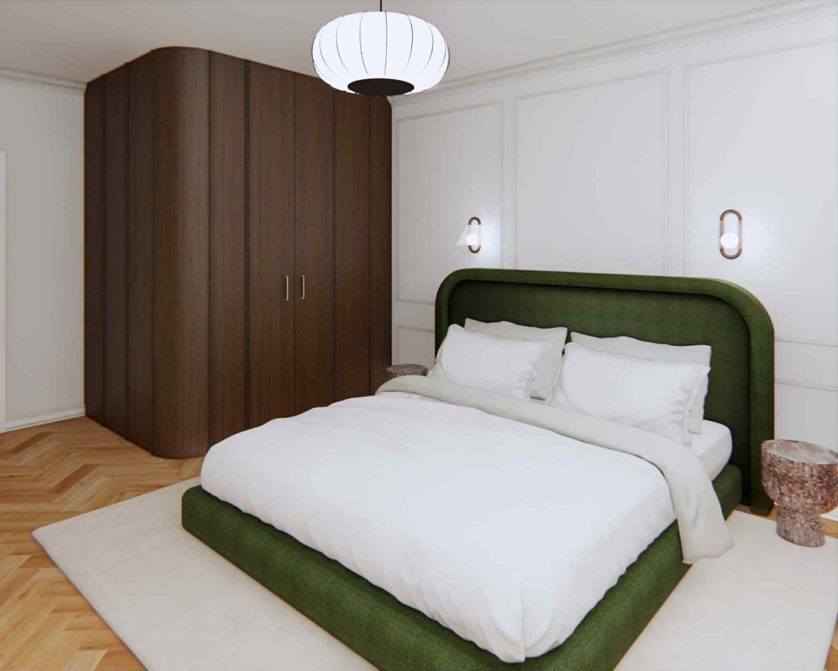 110 m2 powierzchni i składa się z: kuchni otwartej na salon, 2 sypialni, garderoby, łazienki i korytarza.
