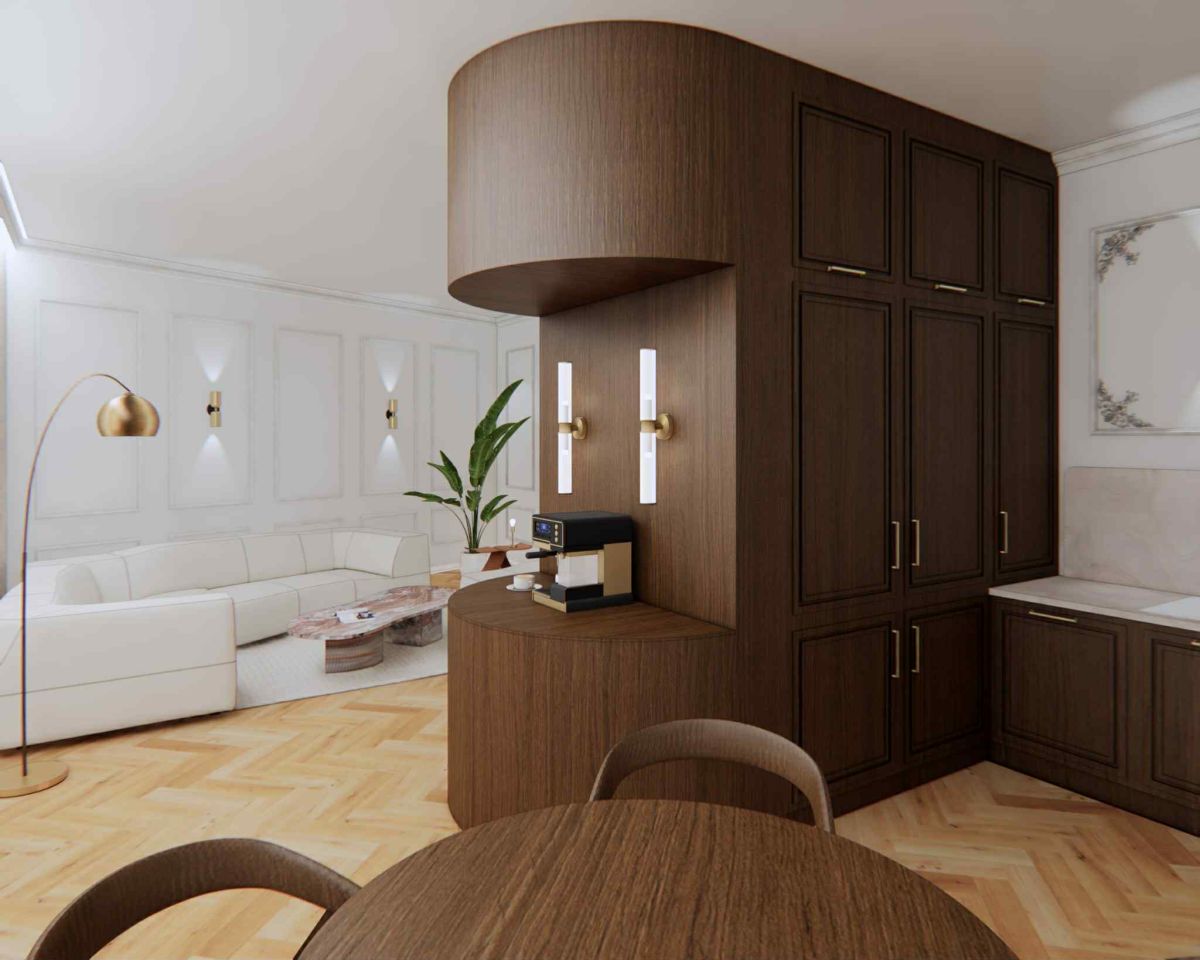 układ pomieszczeń:Po wejściu do mieszkania znajdujemy się w korytarzu. Jest tu miejsce na okrycie wierzchnie dla gości. W głębi znajduje się duża szafa z pralką. Tuż przy wejściu, po prawej stronie, mieści się garderoba z bardzo dużą szafą. Jest to widne pomieszczenie z oknem. Kolejne dwie pary drzwi prowadzą do dwóch niezależnych sypialni podobnej wielkości. Wschodnia ekspozycja pozwala na dobre funkcjonowanie z rytmem dobowym. Rano budzą nas wpadające przez okna promienie Słońca. To bardzo ustawne, ciepłe i jasne pomieszczenia. Niezwykły klimat może nadać odsłonięcie drewnianego parkietu. Na szczycie korytarza znajduje się łazienka wyposażona w wannę z prysznicem. Charakteru dodaje jej nieoczywisty kaloryfer. Po lewej stronie od wejścia znajdują się drzwi do salonu. Zachodnia ekspozycja sprawia, że jest tu jasno do samego końca dnia. Główną ścianę pokoju zdobi sztukateria. Przechodząc przez wydzieloną strefę jadalnianą, docieramy do otwartej kuchni. Strefa jest w pełni wyposażona w sprzęty AGD: zmywarka, lodówka z zamrażarką, płyta indukcyjna, piekarnik, okap.