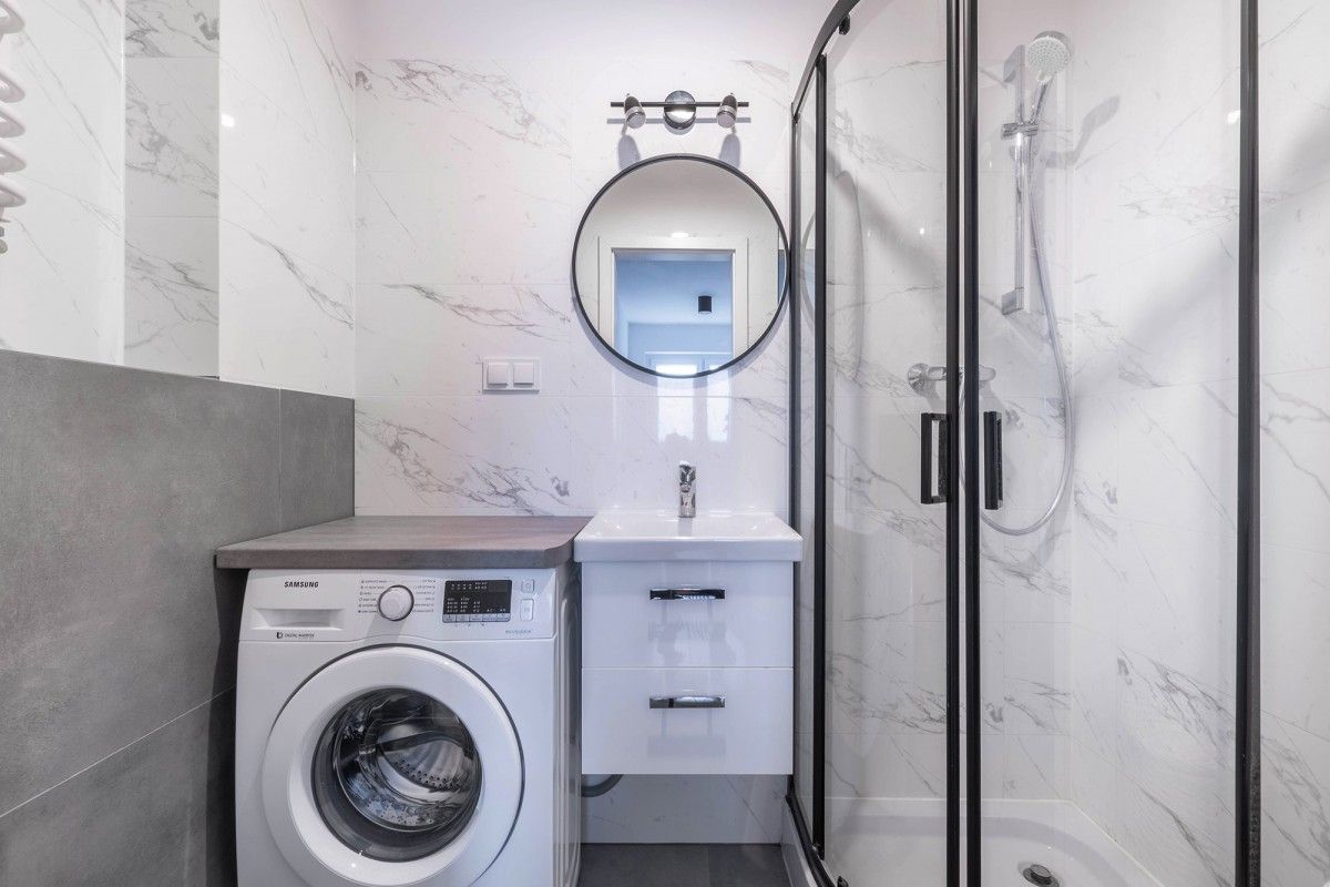Łazienka: z kabiną prysznicową, pralką oraz szafką.