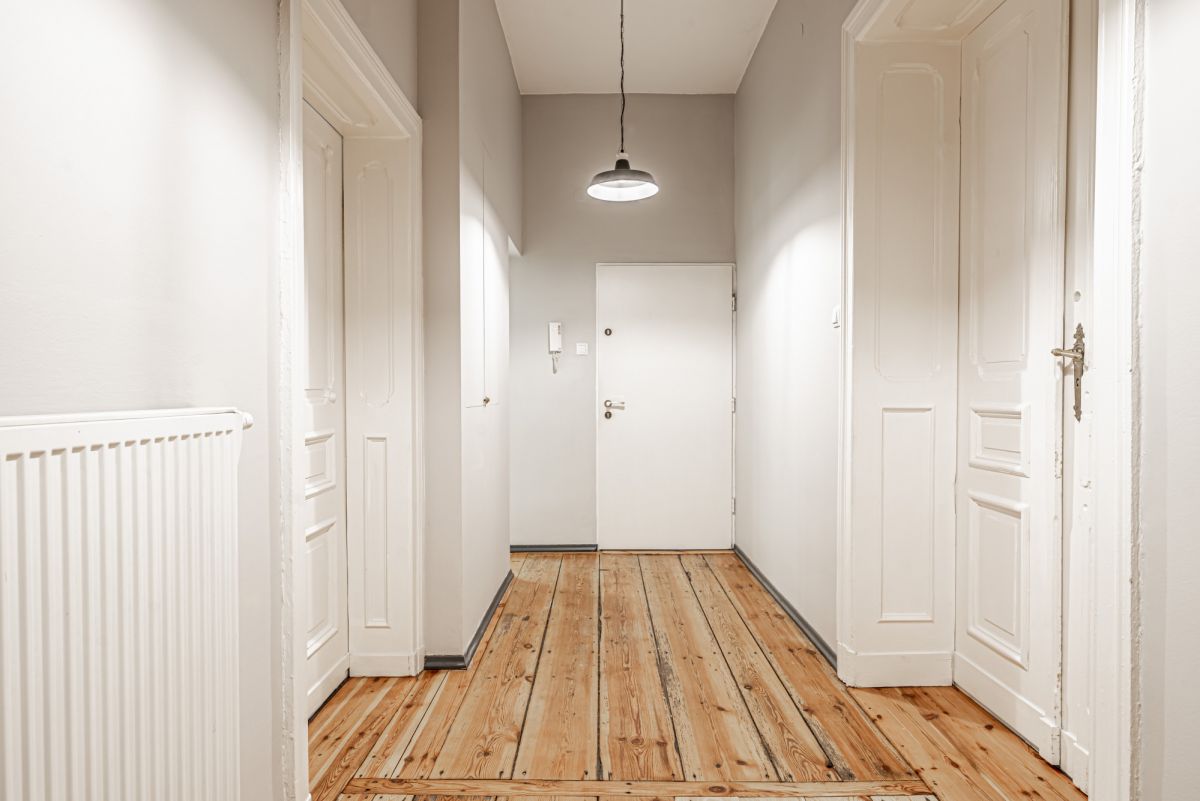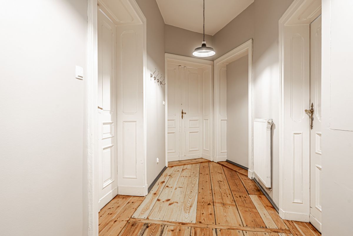 Wejście prowadzi do przestronnego korytarza ok 9 m2. Na lewo od wejścia dwa przepiękne, słoneczne pokoje 26 i 28 m2, z oknami od ul. Świętego Wojciecha, z oryginalnymi drewnianymi podłogami, pięknymi drzwiami i żyrandolami.