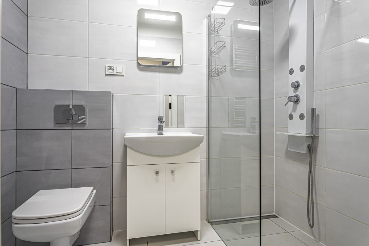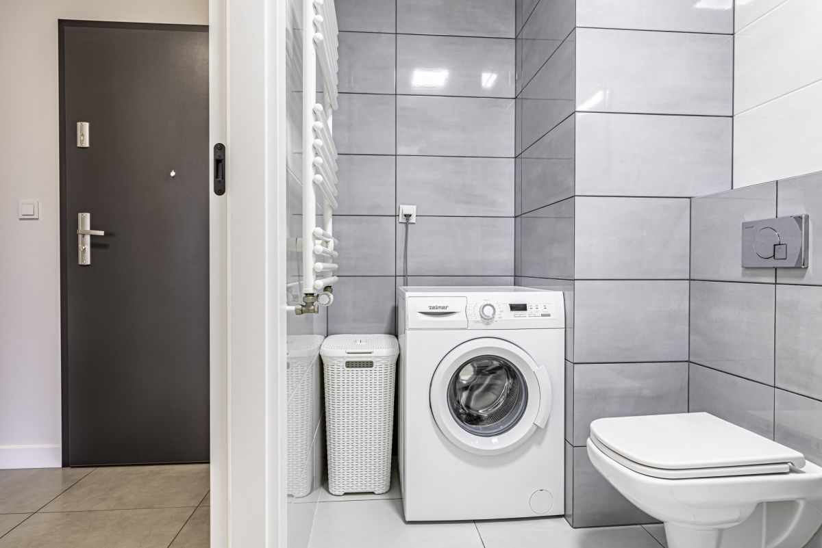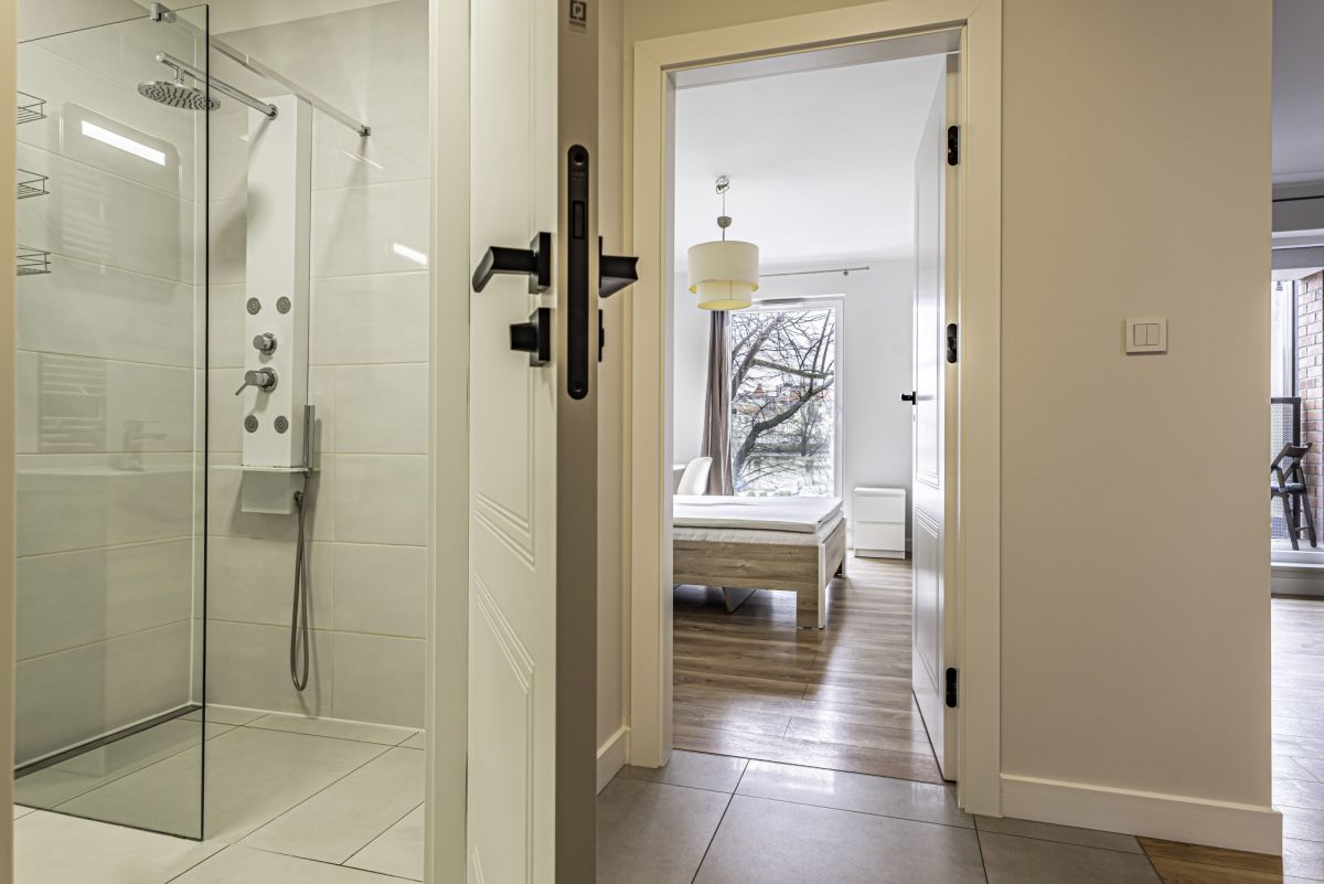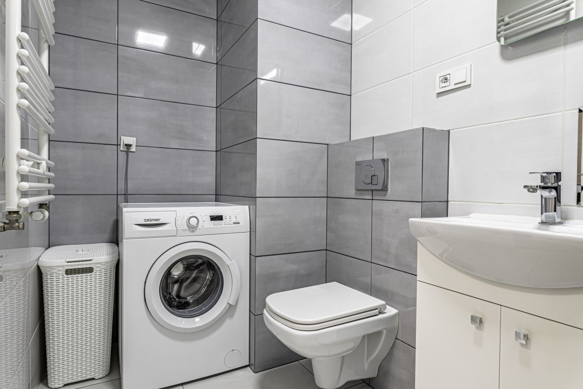 Wejście prowadzi do korytarza, na lewo duża, wygodna łazienka z prysznicem, wc i pralką.