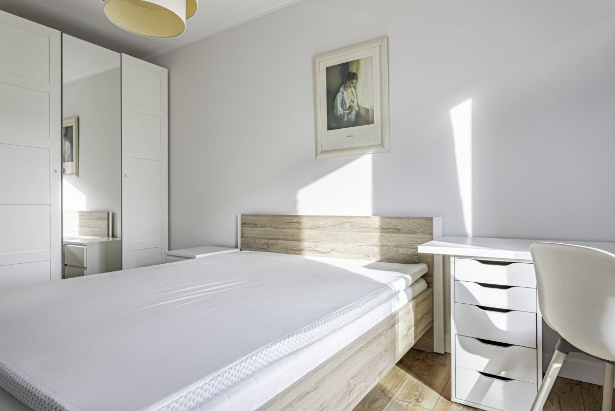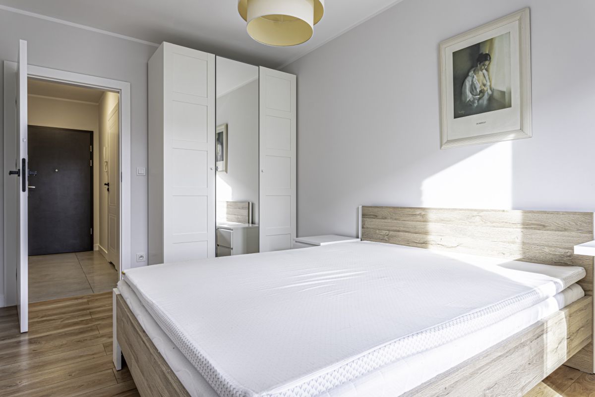 Na wprost wejście do przytulnej sypialni, z dużym komfortowym łóżkiem i trzydrzwiową szafą.