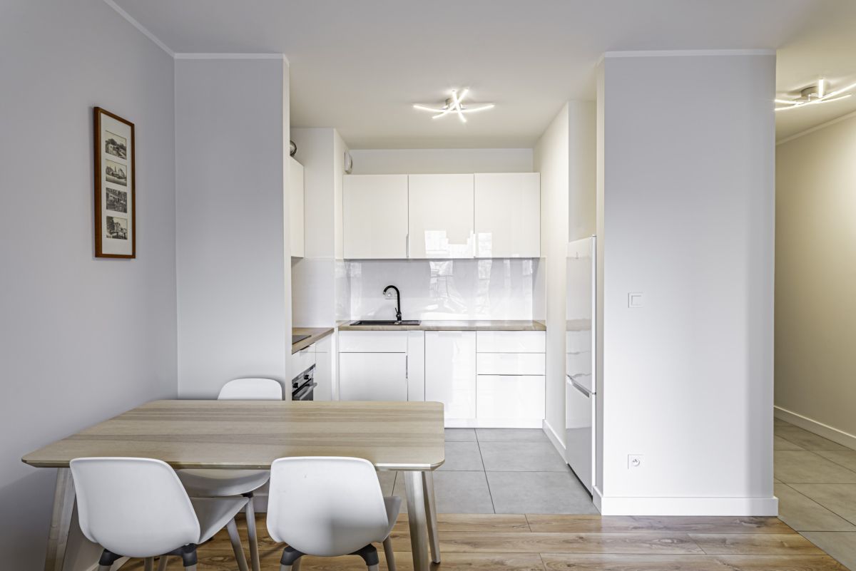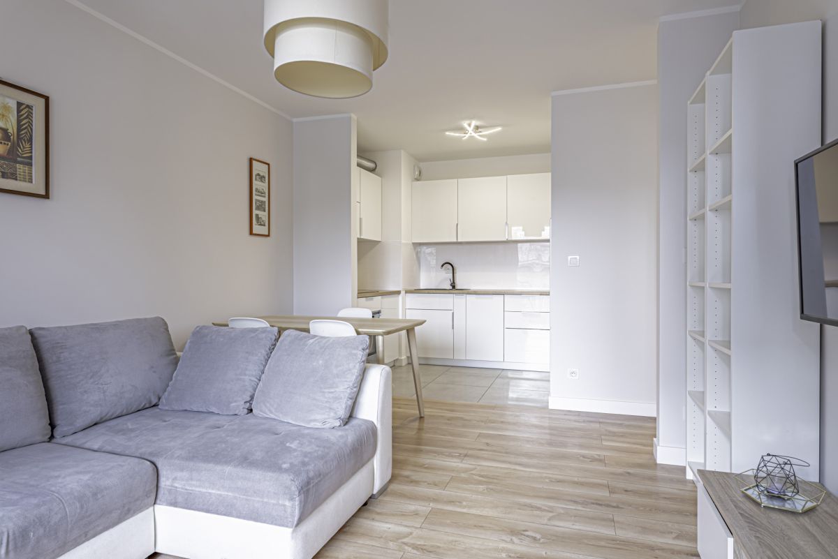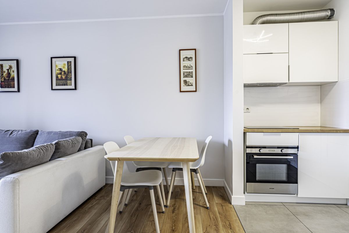 Na prawo wejście do przestronnego salonu z aneksem kuchennym. Pokój zaaranżowany jako strefa wypoczynkowa, z wyjściem na wygodny balkon od strony dziedzińca. Kuchnia w minimalistycznej zabudowie, wyposażona w sprzęty AGD (piekarnik, płyta, okap, zmywarka, lodówka).