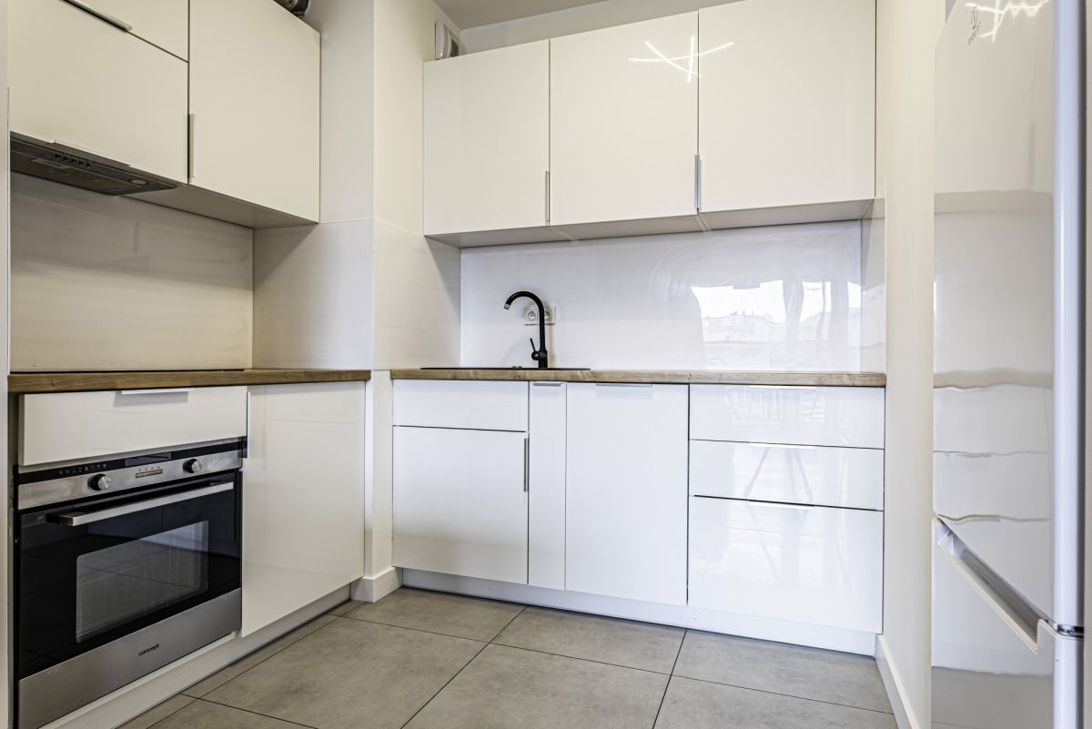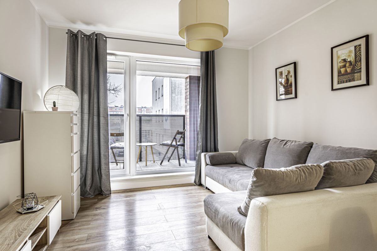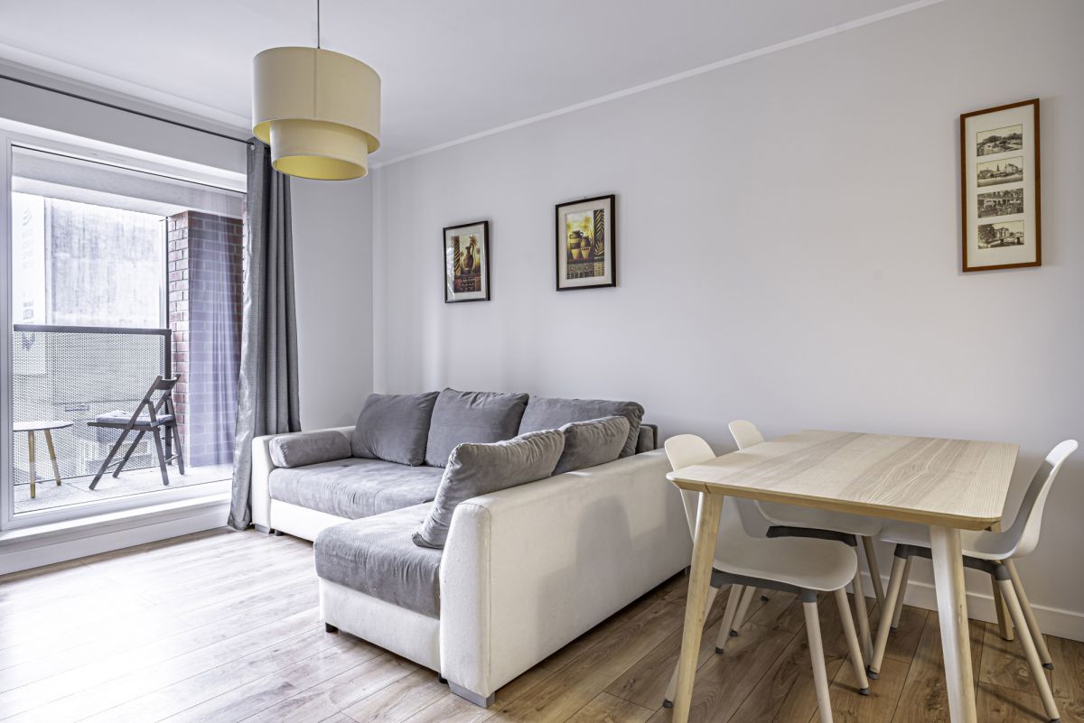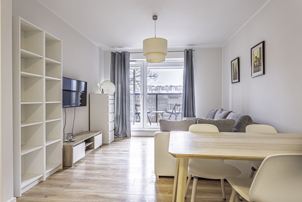 Na prawo wejście do przestronnego salonu z aneksem kuchennym. Pokój zaaranżowany jako strefa wypoczynkowa, z wyjściem na wygodny balkon od strony dziedzińca. Kuchnia w minimalistycznej zabudowie, wyposażona w sprzęty AGD (piekarnik, płyta, okap, zmywarka, lodówka).